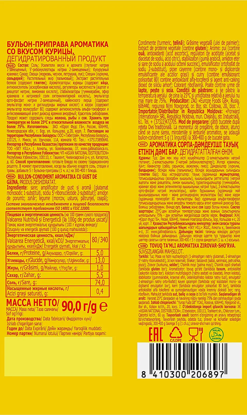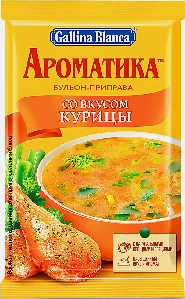 Универсальная смесь 2 в 1. С одной стороны, её можно использовать как рассыпчатый сухой куриный бульон, а с другой — приправлять по вкусу любые блюда: от котлет до мясных салатов. Приправа подарит им не только аппетитный аромат курочки, но и золотистый цвет благодаря куркуме в составе.