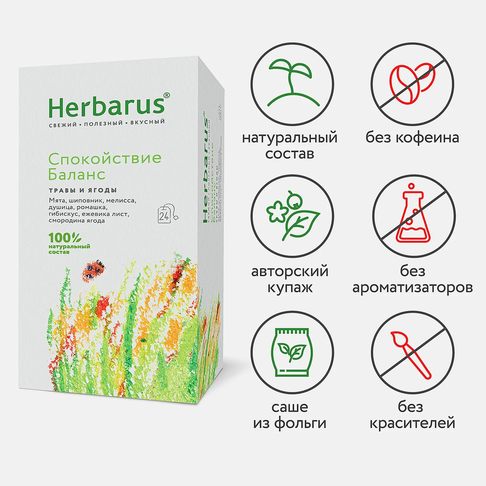 Чайный напиток Herbarus Спокойствие Баланс 24пак — на 100% натуральный продукт, произведенный с учетом всех требований и стандартов ГОСТа. Он имеет приятный освежающий вкус с легкой горчинкой. Чайный напиток содержит цветки ромашки, листья мяты, смородины и мелисы, ягоды ежевики. При регулярном употреблении он успокаивает нервы и улучшает сон, насыщает организм полезными витаминами и микроэлементами, нормализует артериальное давление. Пить его можно в любое время суток. Особенно полезен напиток вечером, после напряженного рабочего дня. Его вкус удачно подчеркнут корица, мед и цукаты. Для удобства чай расфасован в индивидуальные пакетики. Срок годности и условия хранения: 24 месяца, при температуре от 0 до +25 ̊С.