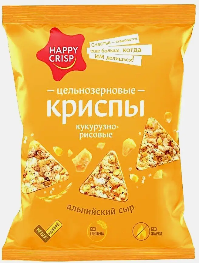 Чипсы Happy Crisp кукурузно-рисовые Альпийский сыр 50г поставляется газонаполненной упаковке. Внутри треугольные снеки, обладающими нежным сливочным вкусом. Продукт изготавливается на основе цельных зерен риса и кукурузы. Он не обжаривается, а нагревается под прессом, поэтому в нем достаточно мало жиров, хотя подсолнечное масло в небольшом количестве присутствует в его составе. Небольшой пакетик криспов можно взять с собой на прогулку, в дорогу, на работу в качестве перекуса, съесть во время просмотра фильма. К ним можно подать различные соусы.