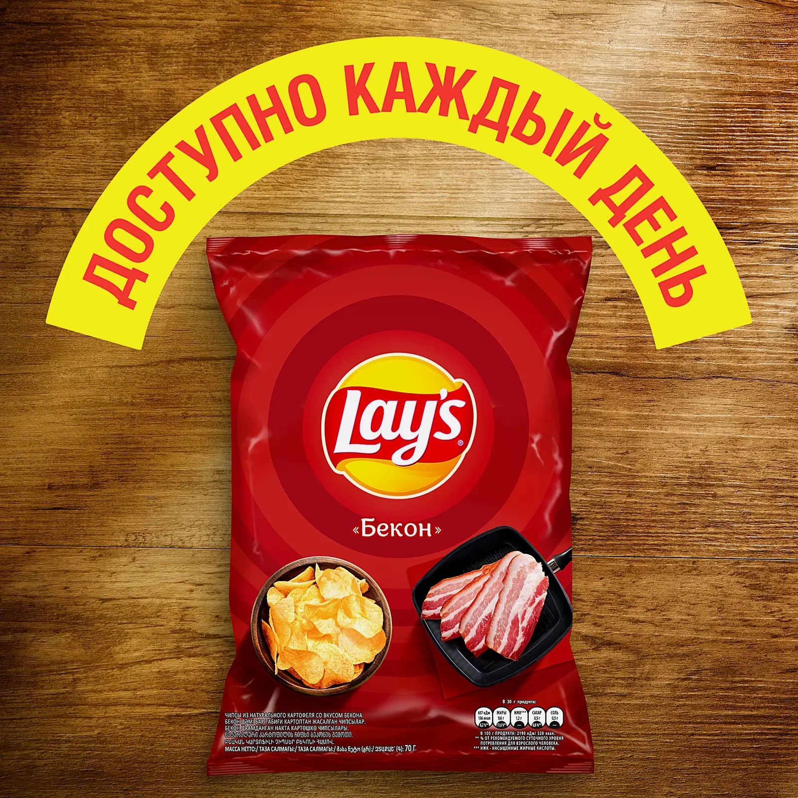 Любимые чипсы с манящим вкусом бекона. У снека хрустящая консистенция, насыщенный аромат, приятный светло-жёлтый цвет. Каждый кусочек обильно посыпан пряностями, которые моментально разжигают аппетит.