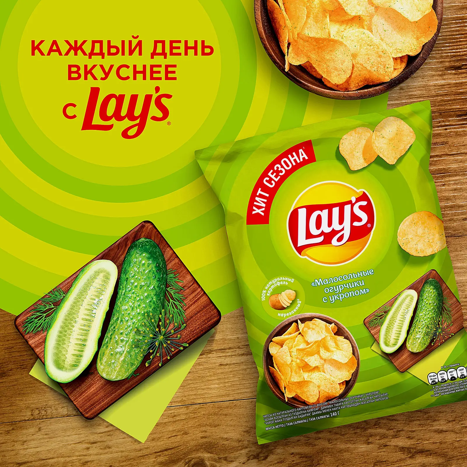 Чипсы из отборного натурального картофеля со вкусом хрустящих малосольных огурчиков и ароматного укропа. Чипсы гладкие — такие удобно макать в густой соус.