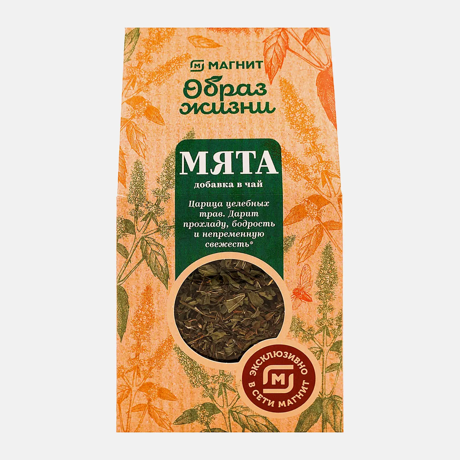 Мята Магнит Образ Жизни 75г — это травяной чай в экологичной упаковке из плотной бумаги, которая самим своим видом сообщает о натуральности и полезности содержимого. В пакете — измельчённая сушёная мята в чистом виде. Её можно использовать как добавку к чаю, а можно заваривать отдельно. Мятный чай облегчает головную боль, успокаивает, улучшает сон. Сухая мята, кроме всего прочего, отличная приправа. Её принято добавлять в греческий салат и другие блюда. Она придаст чудесный аромат печёному или отварному картофелю, добавит свежую нотку мясным блюдам.