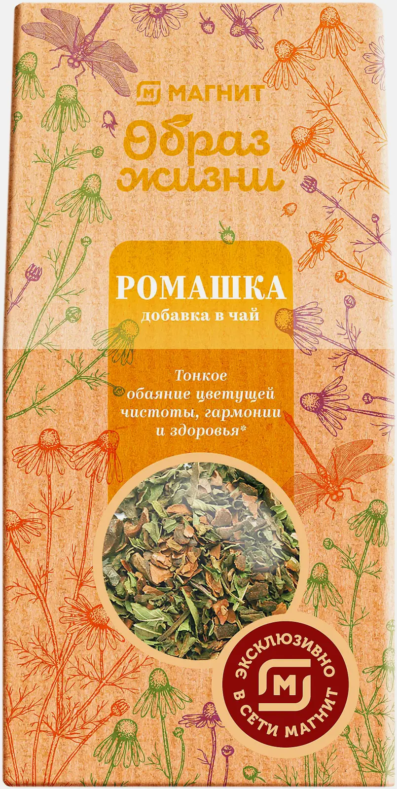 Натуральный чай из высушенных цветков ромашки. Вкус мягкий и слегка горьковатый. Чай содержит эфирные масла бисаболола и хамазулена, которые обладают противовоспалительными и успокаивающими свойствами. Чай идеально подходит для расслабления и улучшения сна.