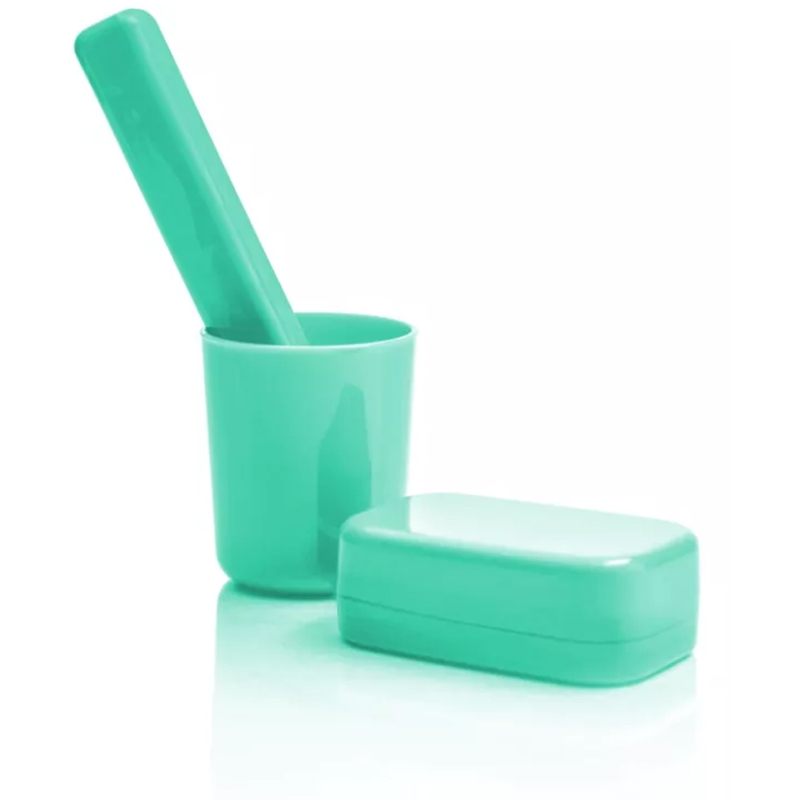 Мыльница и футляр имеют плотнозакрывающиеся крышки, надежно защищающие находящиеся внутри предметы от попадания влаги и возможных загрязнений. Практичный пластиковый стакан может быть использован как в качестве подставки для щетки и зубной пасты, так и в качестве емкости для ополаскивания полости рта.