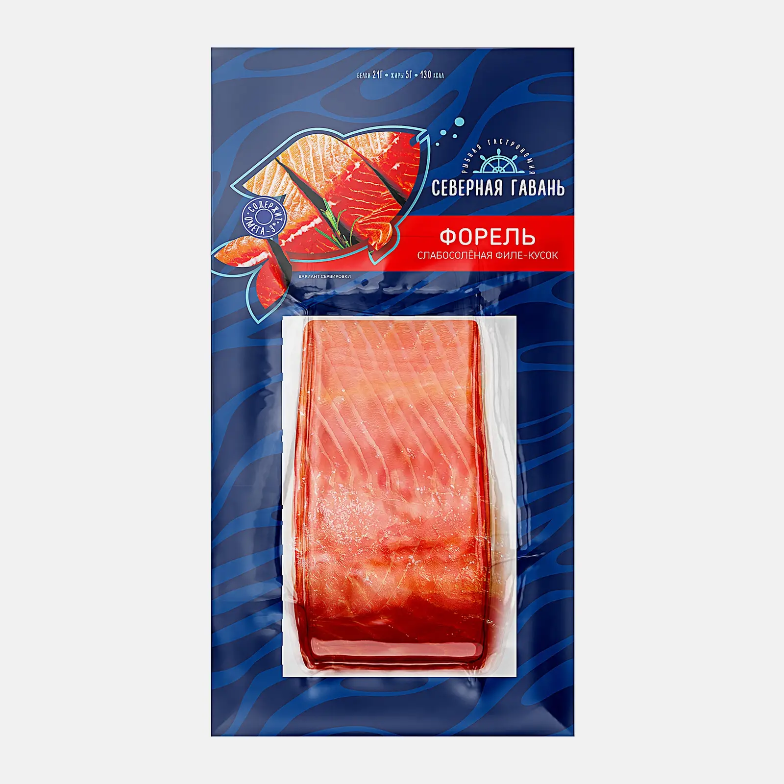 Слабосолёная форель ярко-оранжевого цвета с нежной текстурой и натуральной маслянистостью. Филе-кусок удобно нарезать для сервировки, салатов и закусок. Имеет сбалансированный рыбный вкус с лёгкой солоноватостью.
