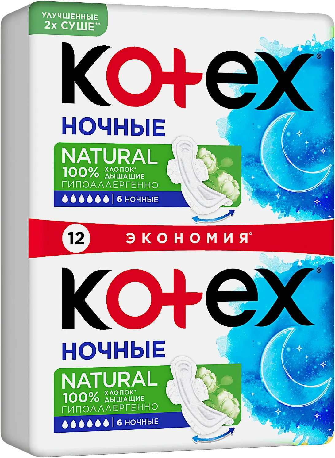Ночные прокладки с верхним слоем из 100% хлопка обеспечивают комфорт и защиту до 100% в течение всей ночи. Уникальный 3D-центр быстро впитывает, мягкие крылышки надёжно фиксируют прокладку, не раздражая кожу. Гипоаллергенные, без пластика и красителей.