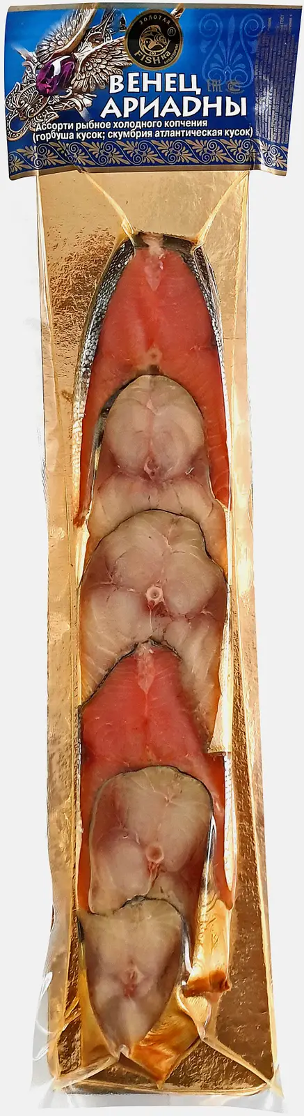Горбуша/ Скумбрия Венец Ариады холодного копчения 250г в ассортименте — отличное решение для быстрого и сытного перекуса. Это нежное филе скумбрии и горбуши, дополненное натуральными специями. Ассорти можно употреблять как самостоятельную закуску или использовать для приготовления легких закусок: бутербродов, сэндвичей, салатов из морепродуктов. Продукт служит полезной добавкой к рациону. Он богат белками, жирными кислотами, витаминами и микроэлементами. В продажу товар поступает в вакуумной упаковке, которая хорошо сохраняет свежесть и аромат копчения содержимого. Срок годности — 90 дней.