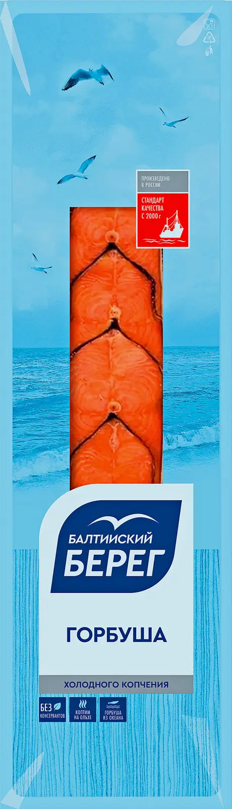 Мясистые кусочки горбуши с малым количеством костей уложены аккуратной «косичкой» и упакованы под вакуумом. Рыба умеренной солёности, копчёная на ольховой щепе, аппетитно пахнет дымком. В составе нет консервантов. Только рыба и соль.