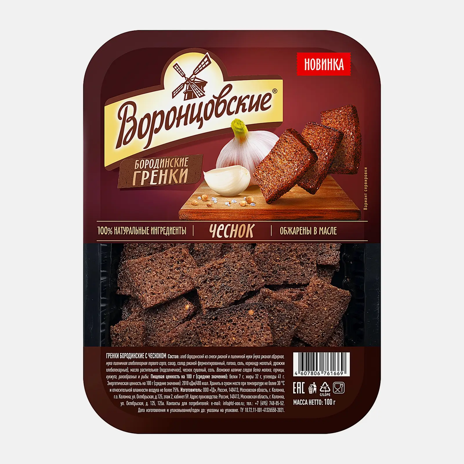 Хрустящие гренки из ржано-пшеничного хлеба с чесноком: порезаны на тонкие слайсы прямоугольной формы и обжарены на масле. Имеют ярко выраженный вкус бородинского хлеба с нотками душистого кориандра и чеснока.