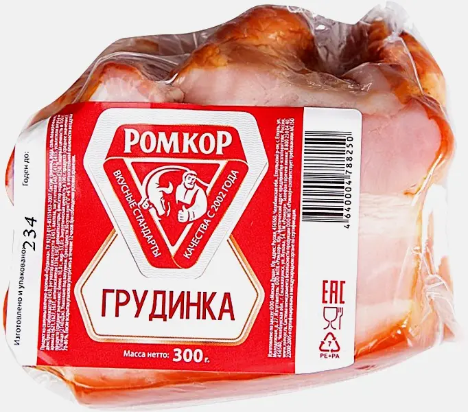 Грудинка Ромкор мини в меру соленая, обладает приятным вкусом и ароматом копчения, которые усиливаются за счет специй. В составе 100% свинина без канцерогенов и ГМО. Продукт создан благодаря технологии горячего копчения, которая делает мясо нежным. Грудинка легко разрезается ножом, не расслаивается, содержит небольшие прослойки шпика. В мясе нет костей. Из грудинки получаются вкусные бутерброды, закуски, пицца, паста карбонара и супы. Она подходит для жарки, запекания или тушения, не теряет аппетитный внешний вид при термической обработке. Упаковано мясо в вакуум. Срок годности и состав — на обороте.