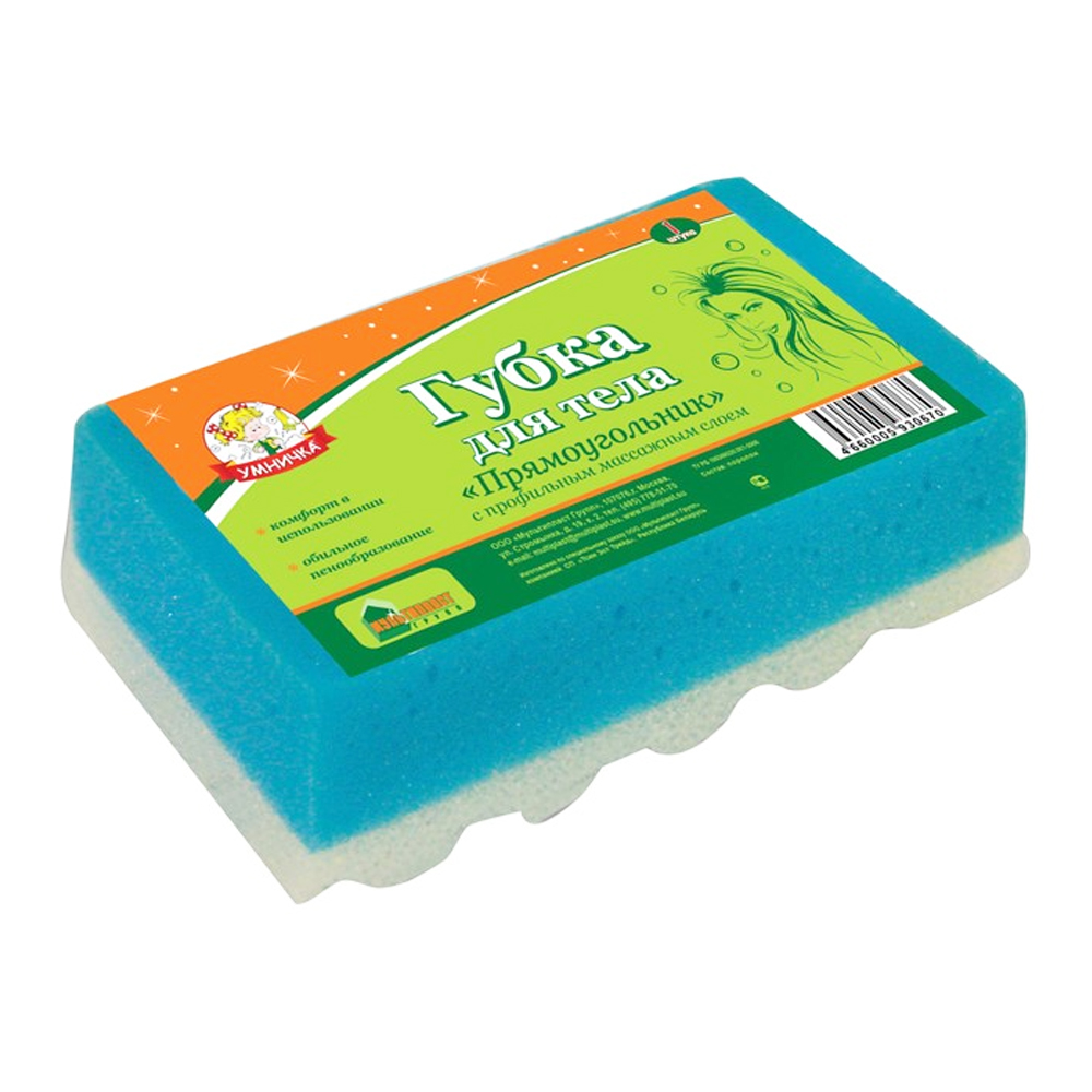 Губка для тела ТМ "Умничка" прямоугольник с профильным массажным слоем. Губка для тела выполнена из специального мягкого поролона, жесткий массажный слой тщательно очищает и прекрасно массирует кожу, усиливая кровообращение. Эффективно устранит загрязнения, ороговевшие клетки кожи, придавая коже бархатистость. Даст густую и обильную пену из мыла и геля для душа. Отлично подходят для ежедневного использования. Для здоровья и красоты вашей кожи!