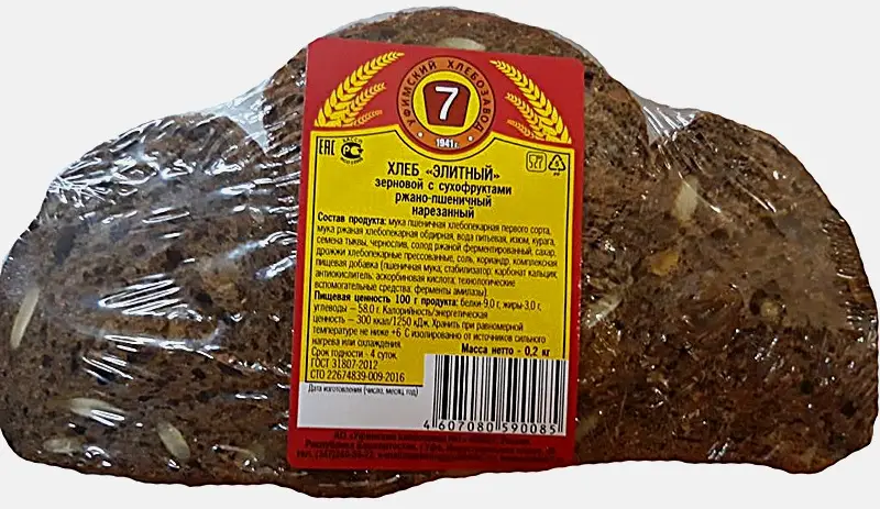Хлеб Элитный зерновой с сухофруктами 200г представляет собой оригинальное хлебобулочное изделие, которое изготавливается из первосортной пшеничной муки, дрожжей, соли, сахара и воды. В состав также входят изюм, курага, семена тыквы и чернослив. Настоящая витаминная кладовая в каждом кусочке. Продукт разработан специально для тех, кто придерживается здорового питания. Он подходит для ежедневного употребления как взрослым, так и детям. Не содержит искусственных ароматизаторов, красителей, консервантов и ГМО.
