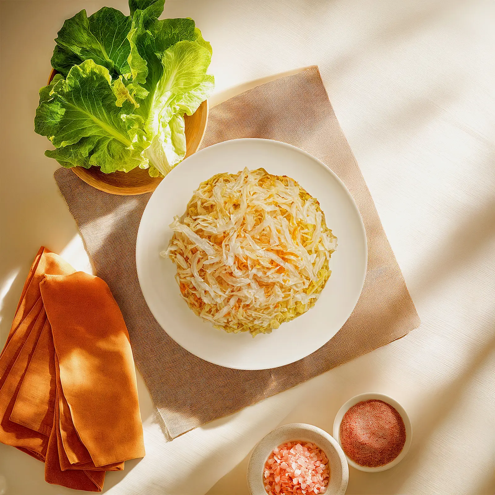 Квашеная капуста с умеренно кислым, островатым вкусом и аппетитной хрустящей текстурой. Хрен добавляет закуске жгучего, «колючего» аромата.