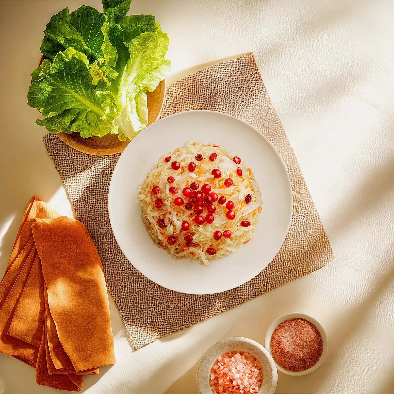 Хрустящая капуста с пряным вкусом и лёгкой клюквенной кислинкой — сочная и выразительная закуска.