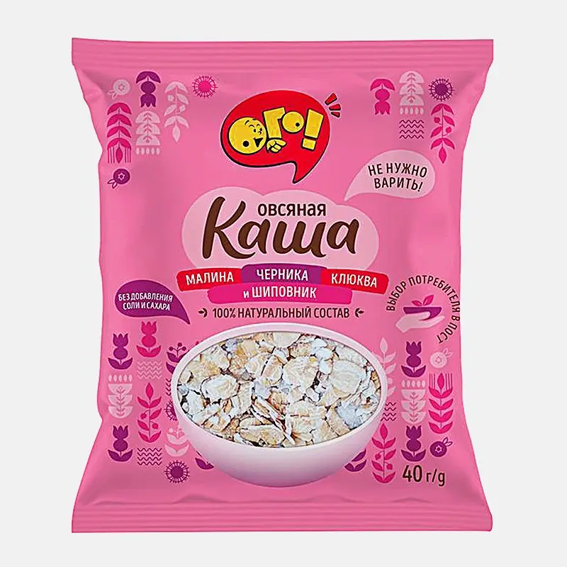 ОГО! Каша Овсяная с малиной, черникой, клюквой и шиповником 50г сашет (Эверест ООО) :15 - сытный и продукт, который станет хорошим вариантом для питательного завтрака и легкого полдника. Он представляет собой нежную овсянку с добавлением кусочков ягод и достаточно прост в приготовлении, потому что его не нужно варить - его следует залить кипятком или горячим молоком в количестве, указанном на упаковке, и подождать несколько минут. Одного небольшого пакетика хватит, чтобы на долгое время утолить чувство голода. Каша поставляется в компактной упаковке, которую удобно брать с собой на работу или в дорогу.