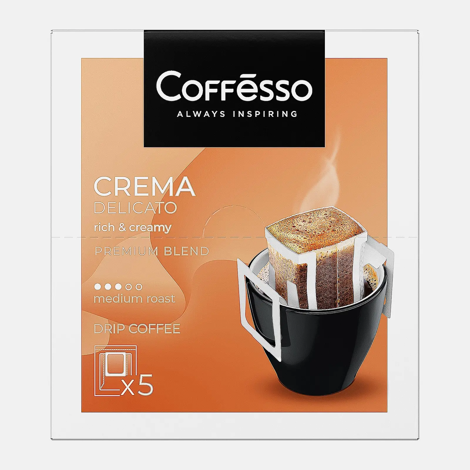 Кофе молотый Сoffesso Crema Delicato 5 пак х 9 г производится из 100%-й, сбалансированно обжаренной арабики. Этот натуральный молотый напиток в сашетах позволит насладиться изысканным вкусом и насыщенным ароматом, оценить бархатистую консистенцию природного сырья. А при добавлении молока или сливом кофе становится еще более нежным. За счет порционных вакуумных пакетиков пить его можно где угодно: от поездок и путешествий до кофе-брейков, пикников и фуршетов. Все, что нужно, — раскрыть его, установить на чашку и медленно вливать кипяток. Сашеты герметичны и прочны, сохраняют все свойства продукта и защищают от внешних воздействий.