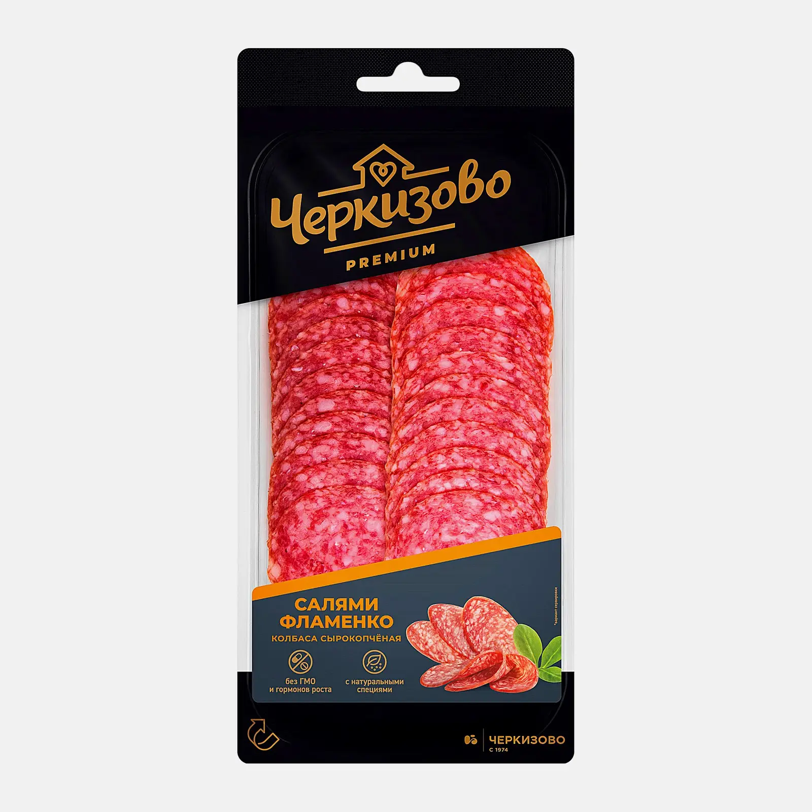 Колбаса приготовлена из мякоти свинины. На срезе мясо естественного нежно-розового цвета. Его оттеняют белоснежные вкрапления мелкозернистого шпика.