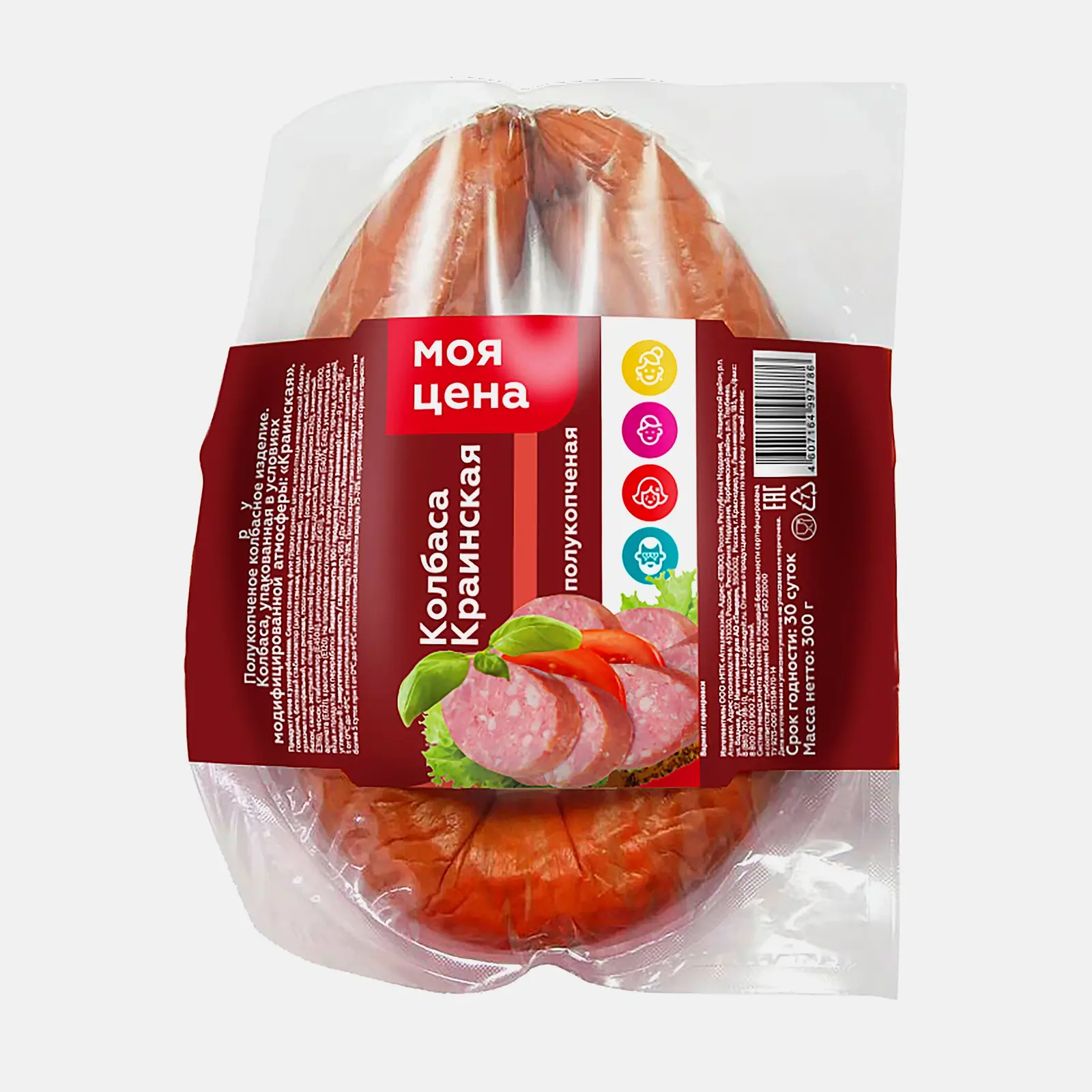 Полукопчёная колбаса с аппетитной румяной оболочкой и плотной текстурой. В разрезе хорошо заметны кусочки шпика, придающие сочность. Нотки специй подчёркивают сбалансированный вкус.