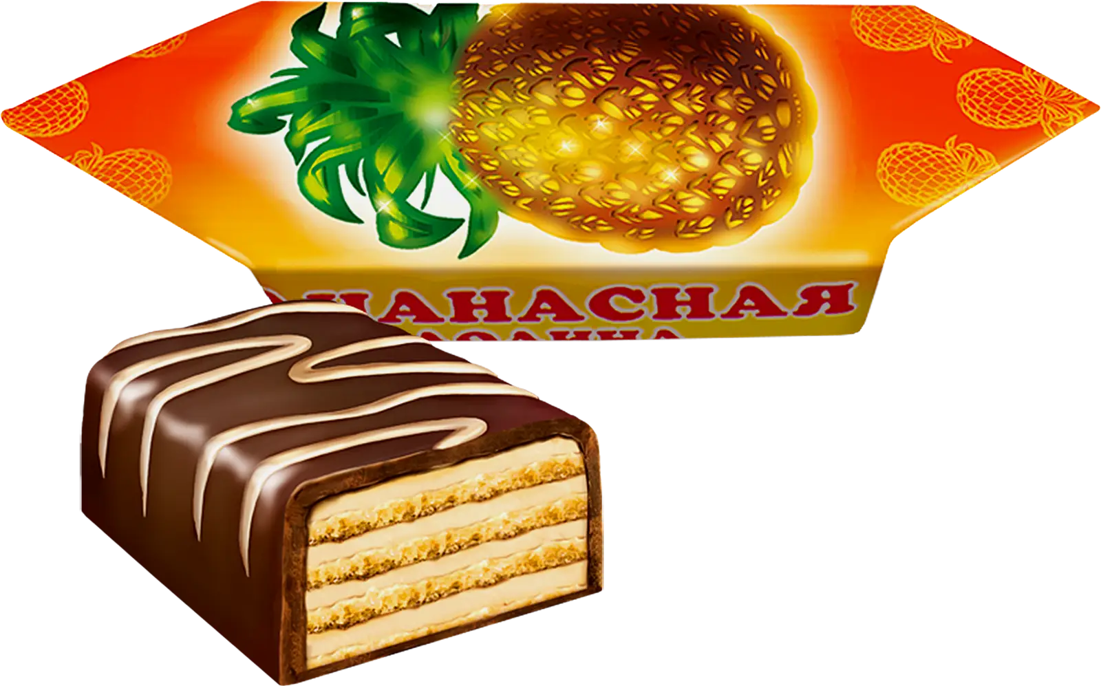 Отличается насыщенным и сладким, но не приторным вкусом, пикантность которому придает освежающая тропическая кислинка. Такой десерт понравится как взрослым, так и маленьким сладкоежкам и составит удачное сочетание с кофе, чаем, какао и другими напитками. Лакомство с хрустящей и рассыпчатой текстурой вафли со всех сторон покрыто тонким слоем шоколадной глазури. Каждая конфета помещена в индивидуальную упаковку с изображением сочного ананаса. Продукт насыщает и восстанавливает силы, пополняет запасы энергии и приносит пользу организму. Он улучшает концентрацию внимания и работу мозга, благотворно влияет на нервную систему, дарит позитивное настроение.