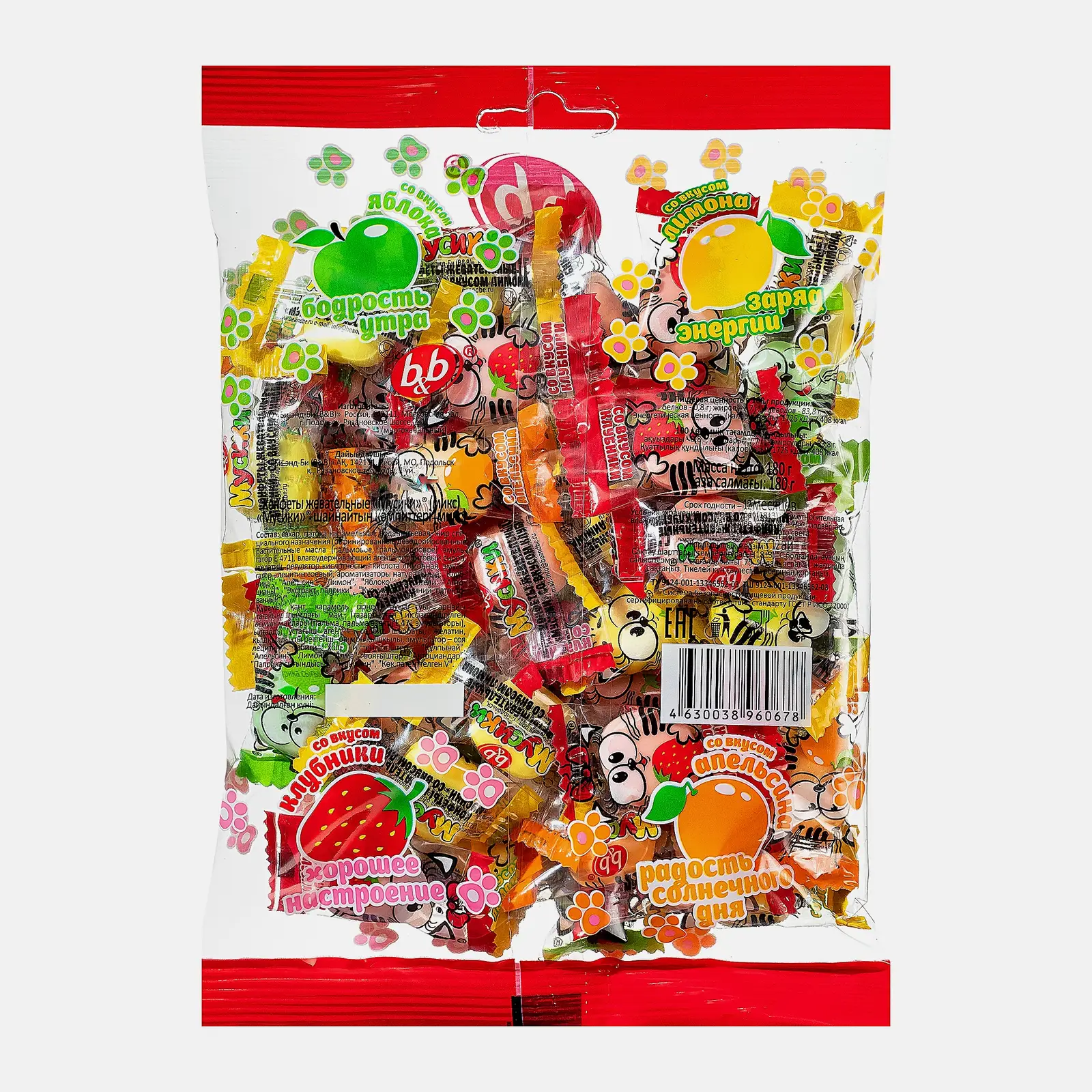 Жевательные фруктовые конфеты выполнены в форме подушечек, где каждая упакована в индивидуальный фантик, что очень удобно в дороге и большой компании. Вкусы разные: яблоко, апельсин, клубника и лимон.