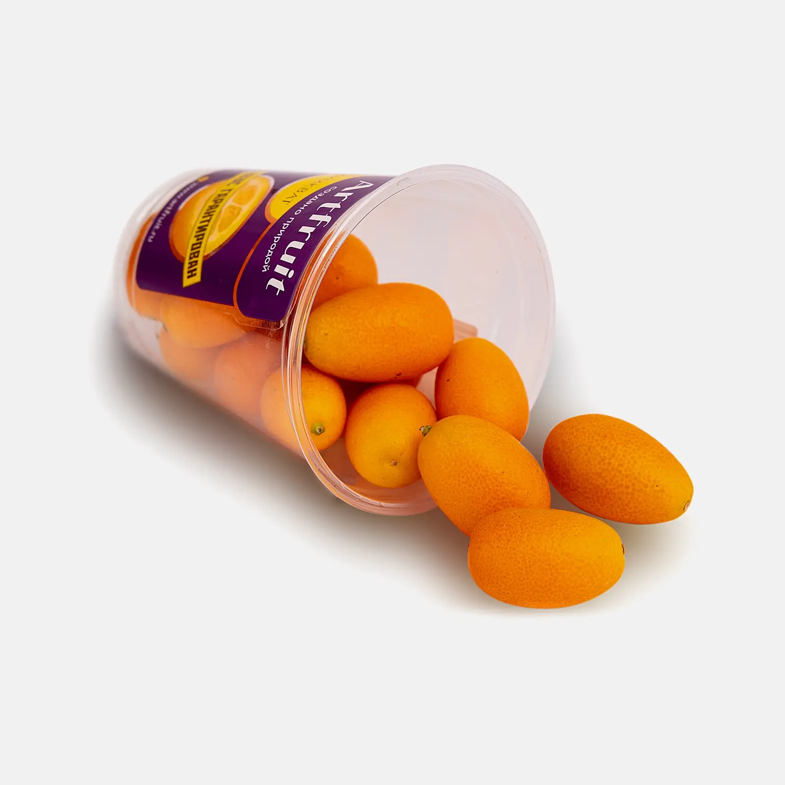 Кумкват 200г относится к семейству цитрусовых. Его плоды бывают овальными, круглыми или яйцевидными. Цвет у них обычно желто-оранжевый, насыщенный. У них очень интересный вкус: тонкая кожура терпко-сладкая, а мякоть напоминает кислый мандарин, поэтому едят их целиком, неочищенными. В кулинарии их используют для приготовления десертов, добавляют в кремы. Ими украшают сладкие блюда; свежими или цукатами. Из них получаются вкусные коктейли, джемы, варенье и вино. Они отлично сочетаются с мясом и птицей, могут стать основой соуса. Их можно добавить в овощные или фруктовые салаты. Этот фрукт содержит много полезных веществ. В нем есть витамины, особенно много вит. С, микро- и макроэлементы, клетчатка, аминокислоты, антиоксиданты и эфирные масла. Он стимулирует обменные процессы, поэтому его рекомендуют употреблять во время диет и включают в рацион при ожирении. Его используют при простудах.