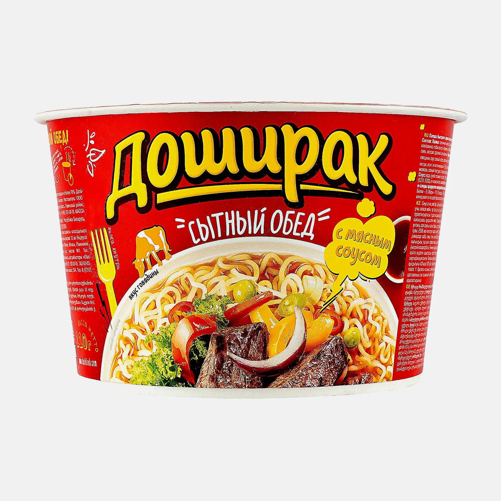 Лапша Доширак Сытный обед со вкусом говядины 110г сэкономит время на создание горячего сытного обеда. Его основа (брикет из макаронных изделий) изготовлена из пшеничной муки. Добавкой к ней служит приправа с сушеной морковью, луком, мясными хлопьями и сухой бульон на основе специй. Перед употреблением компоненты следует соединить, залить горячей водой и настоять 5 минут под крышкой. Аппетитный гарнир получается рассыпчатым и ароматным, а бульон в меру острым благодаря красному молотому перцу. Перед подачей блюдо можно украсить свежими овощами. Оно легко усваивается и надолго утоляет голод. Продукт изготовлен по корейским технологиям и прошел строгий контроль качества. Компактная упаковка позволяет брать его на работу, в путешествие или в поход.