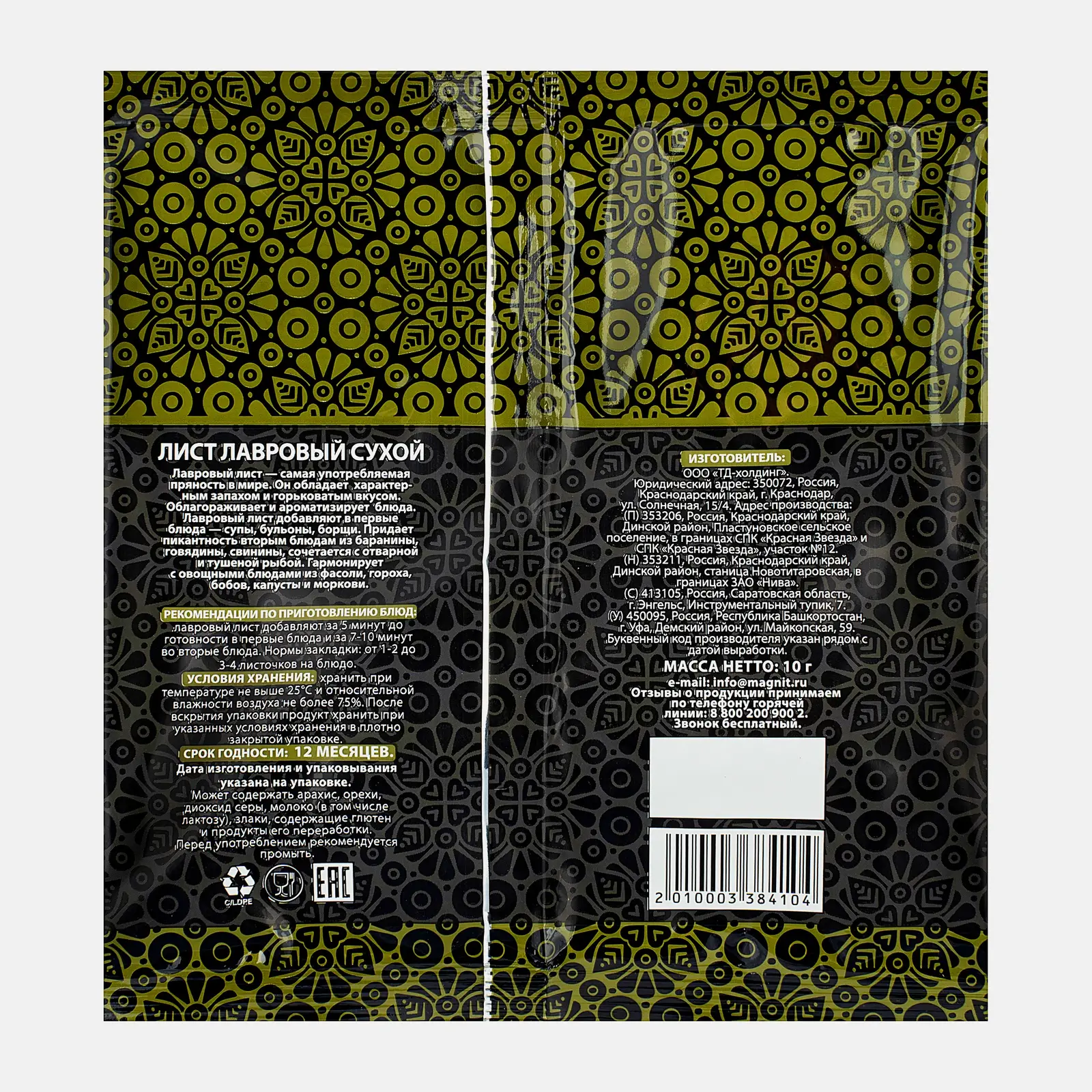 Универсальная приправа придаёт блюдам глубину вкуса и пряную свежесть. Наши лавровые листочки целые и зеленоватого цвета. Мы изготовили их из качественного сырья на одном из 6 производств Магнита, входящих в ТД-Холдинг. Наше предприятие уже более 20 лет выпускает продукты — от круп и специй до замороженных полуфабрикатов и снеков.