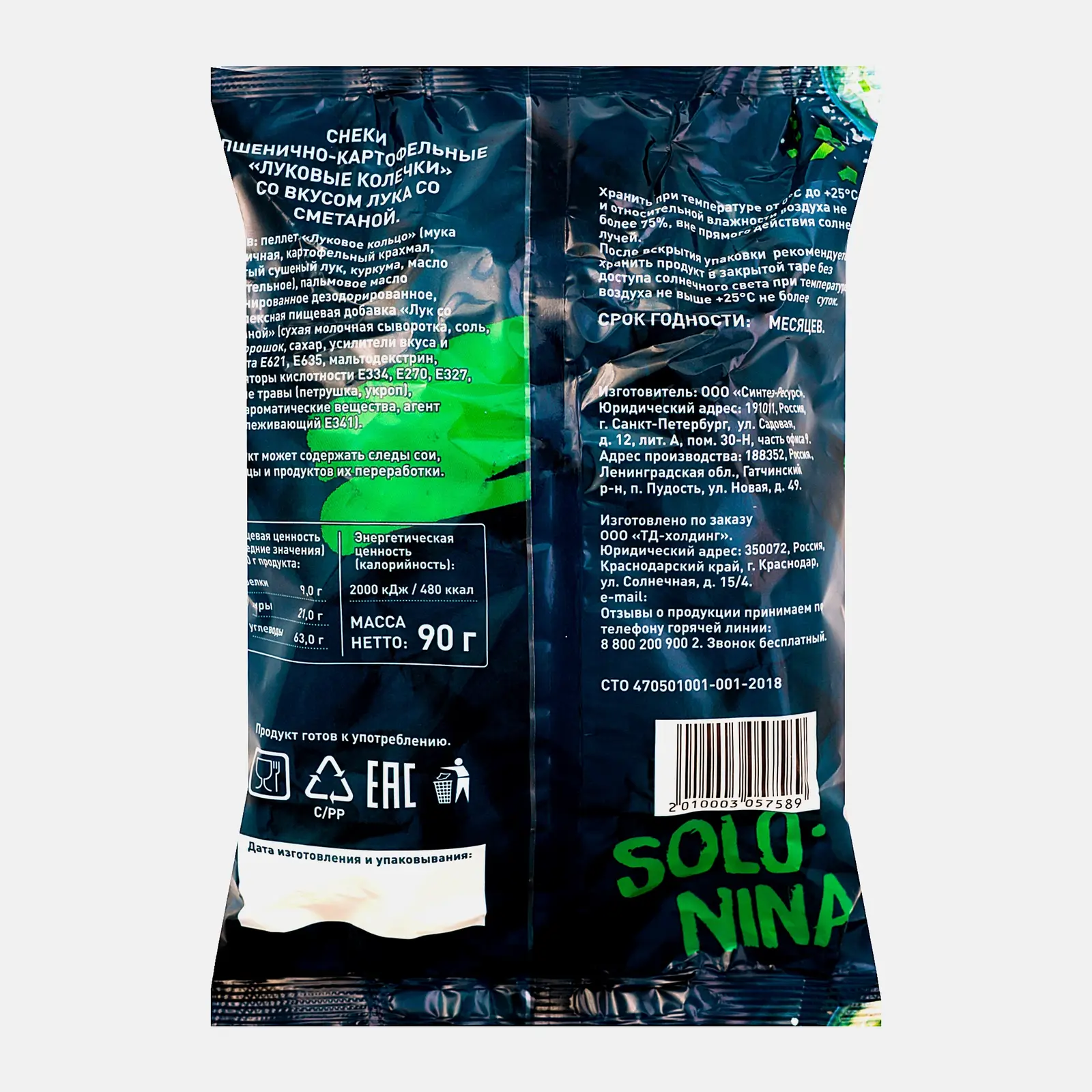 Луковые кольца Solo Nina со вкусом сметана и лук 90г — хрустящие снеки с насыщенным вкусом. Подходят для перекуса в течение дня, их удобно брать с собой на прогулку или в путешествие, но ещё приятнее — делиться ими с друзьями. Такая закуска пригодится во время вечернего просмотра фильма или в качестве ингредиента для приготовления оригинальных салатов. Кольца хороши как сами по себе, так и с лимонадом, соками, компотами, а также с пенными напитками. Упаковка флоу-пак легко открывается, выполнена в приятном дизайне с изображением продукта и вариантом подачи.