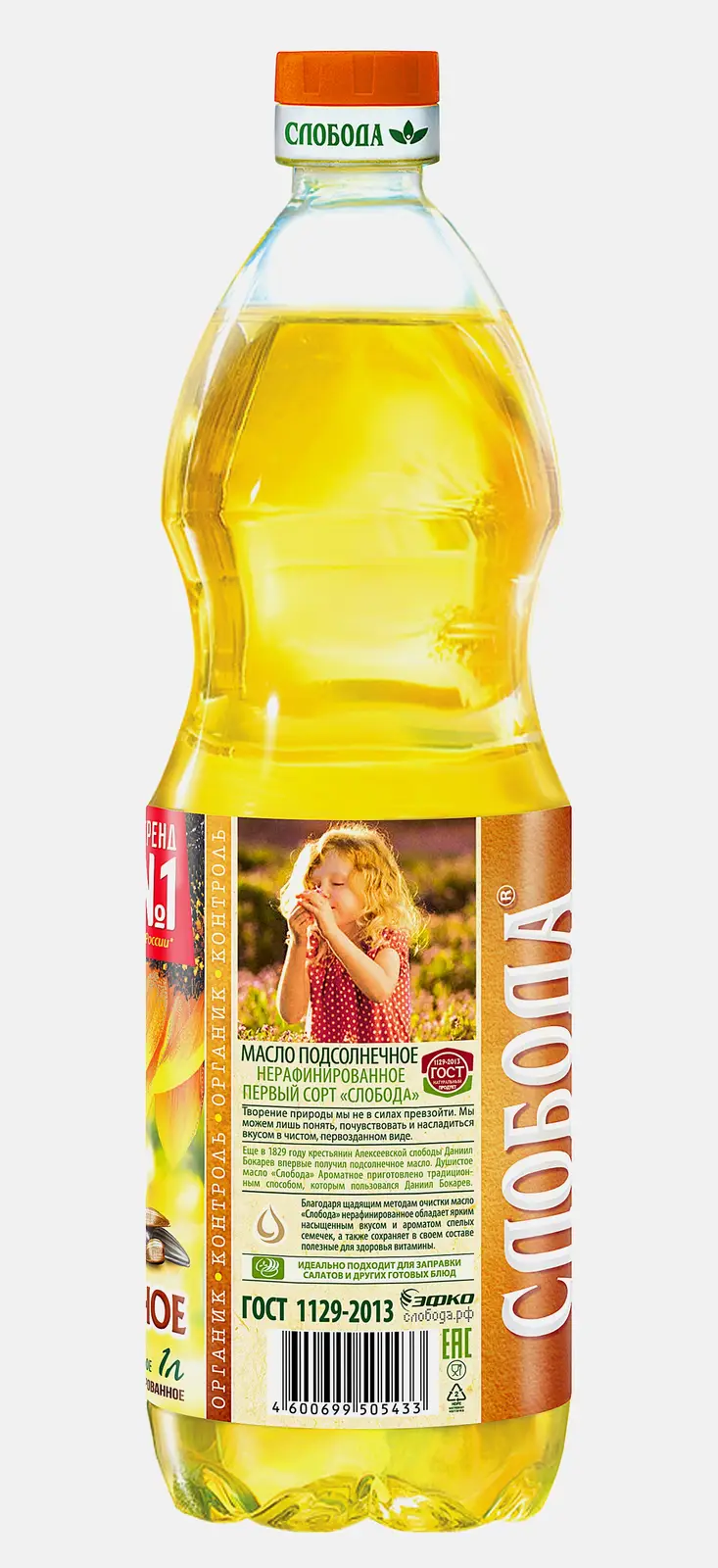 Нерафинированное подсолнечное масло. У продукта выраженный жёлтый цвет и однородная консистенция. Его насыщенный аромат прекрасно раскрывается в салатах и закусках, делает их аппетитнее и ещё вкуснее.