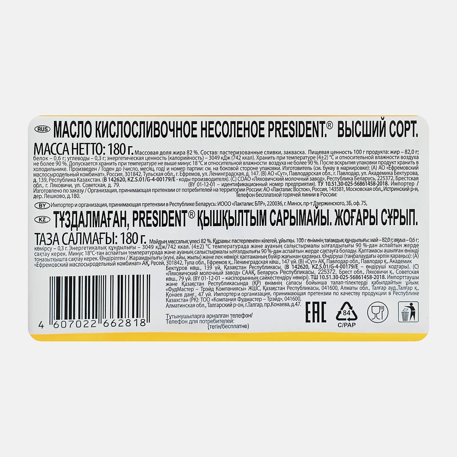 Масло сливочное President несоленое 180г
