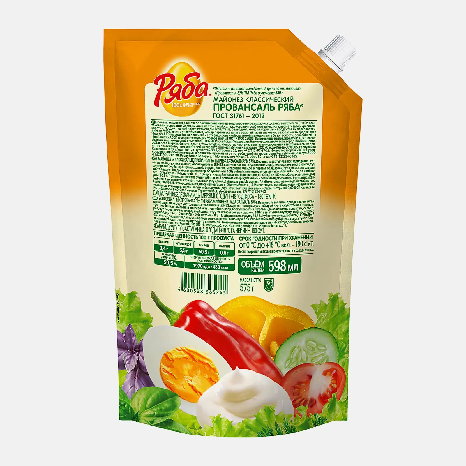 Классический майонез подходит для заправки салатов, маринадов и запекания. Удобный дой-пак 575 г облегчает использование и хранение.