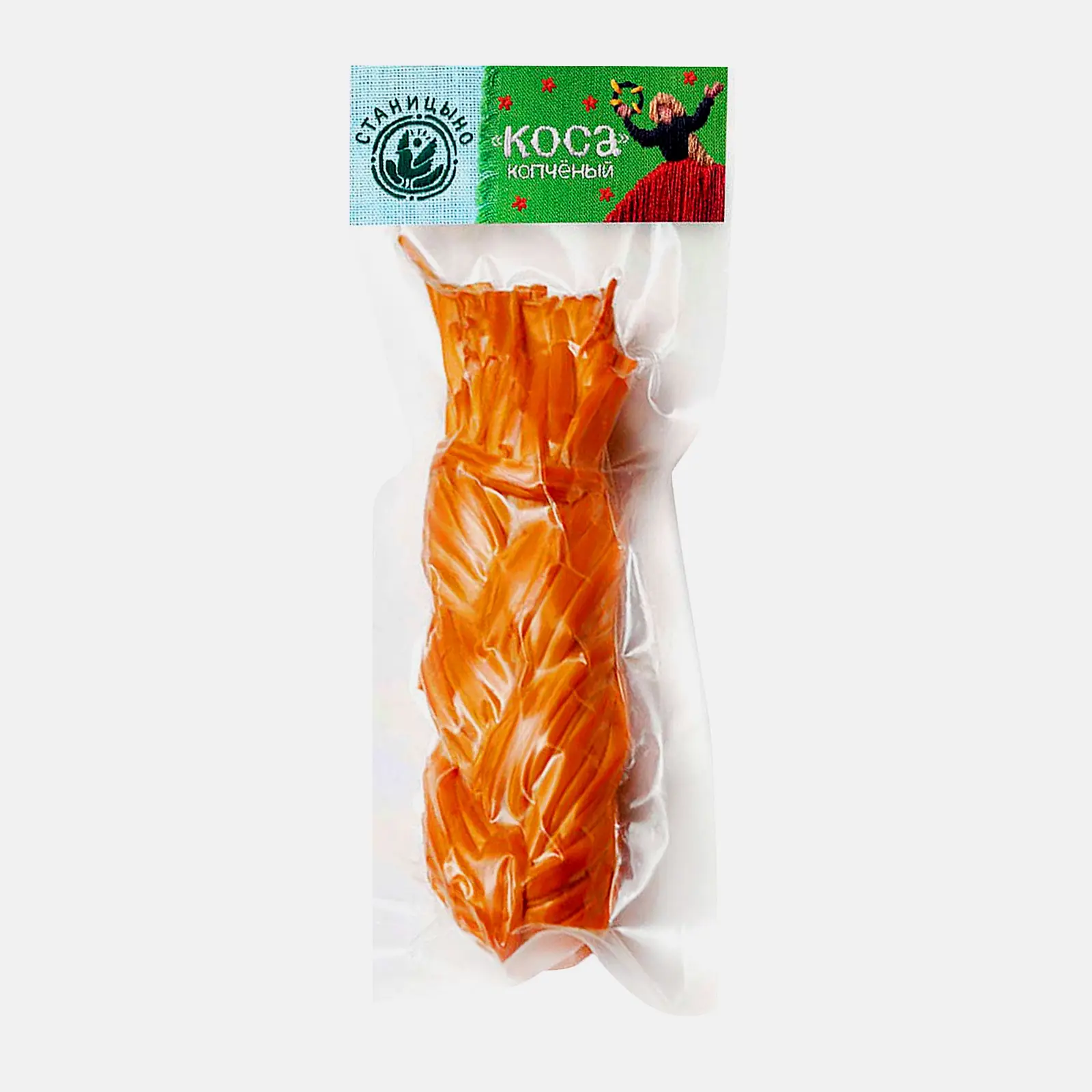 Копчёный волокнистый сыр-косичка с ярко выраженным пикантно-солёным вкусом и тонкими острыми нотками. У продукта приятный светло-жёлтый цвет, насыщенный сырный аромат и характерное сливочное послевкусие.