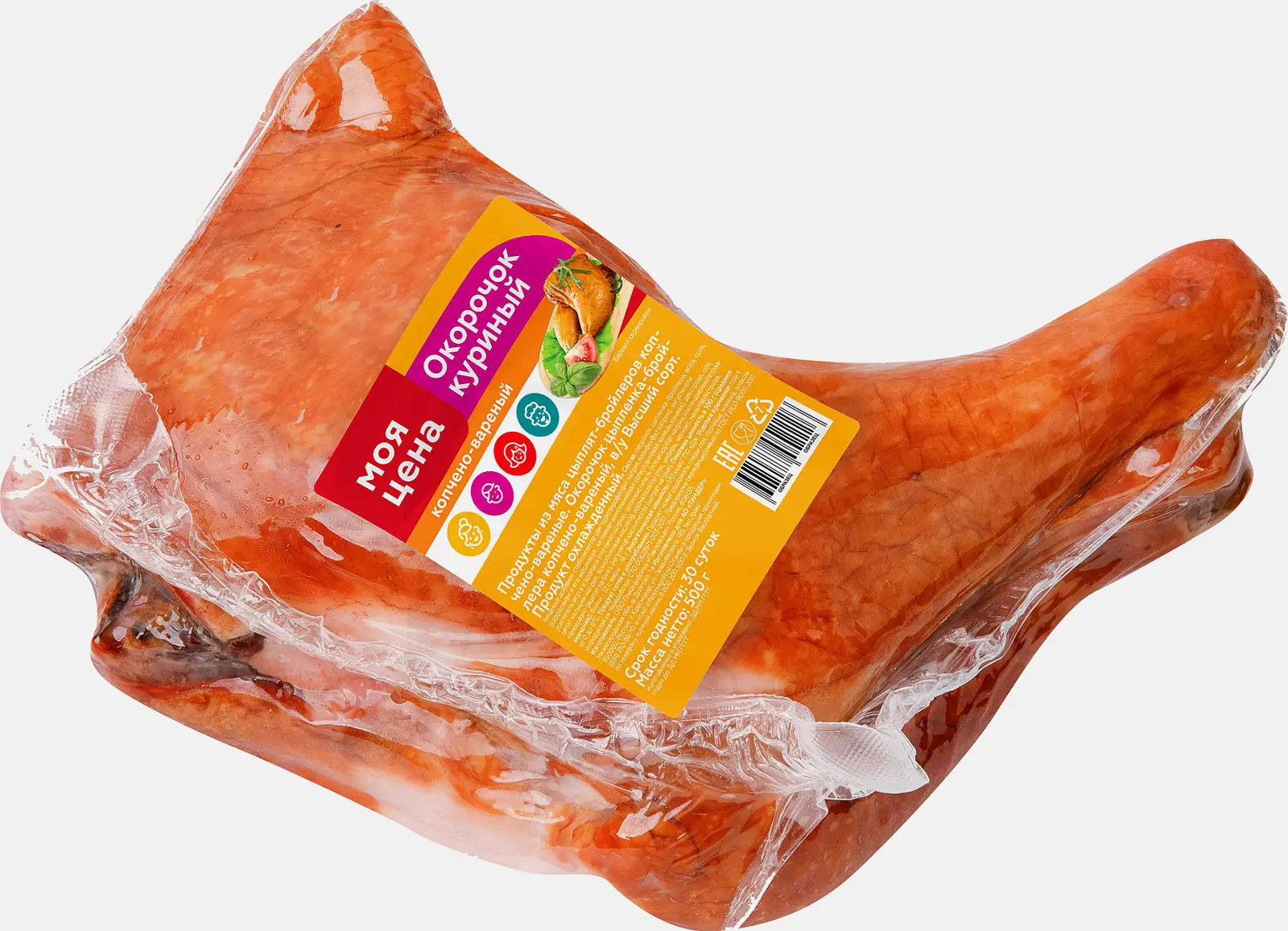 Копчёно-варёный окорочок цыплёнка-бройлера — охлаждённый деликатес с красивой корочкой и нежным мясом. Продукт обладает превосходным вкусом и приятными нотами ольхового копчения.