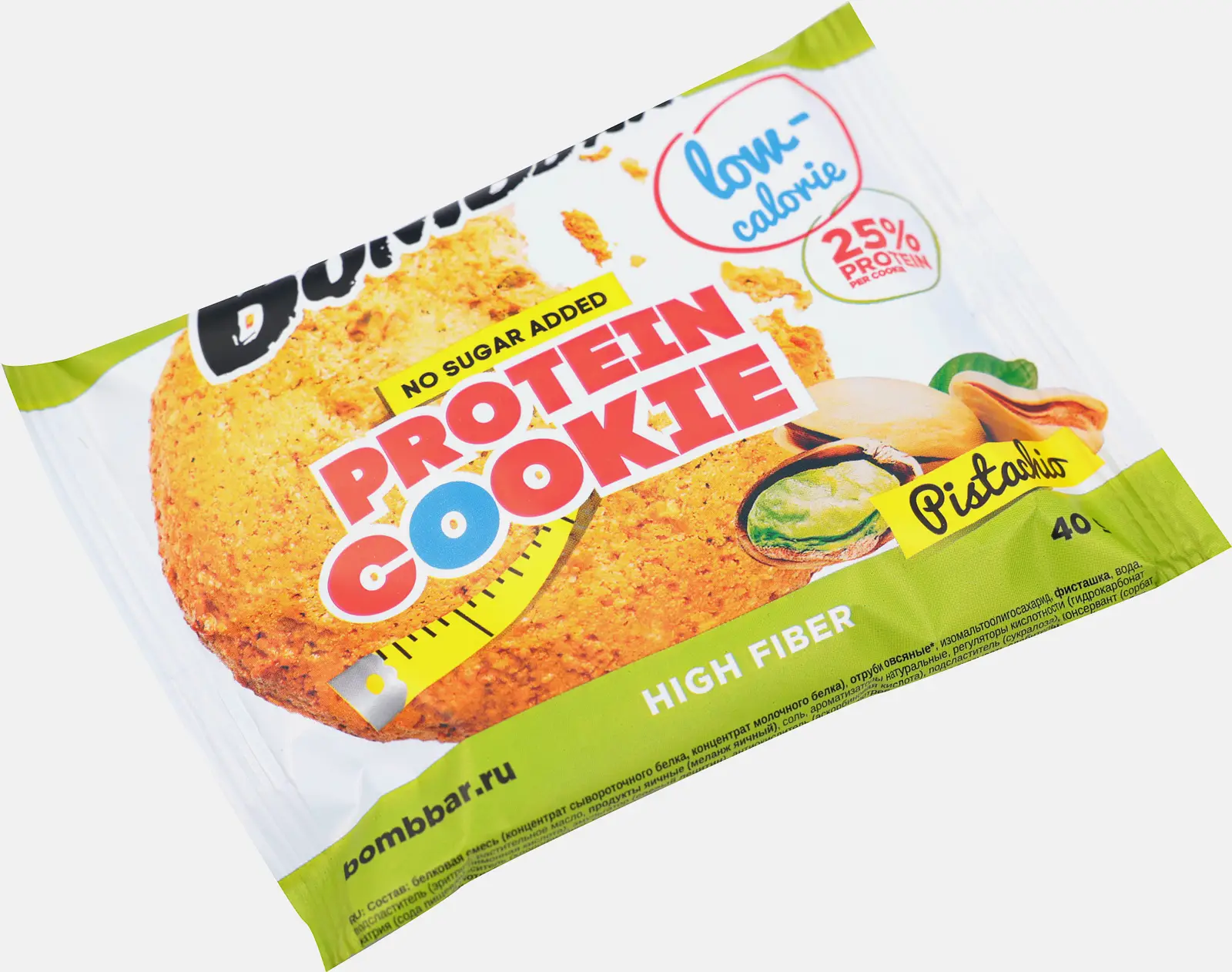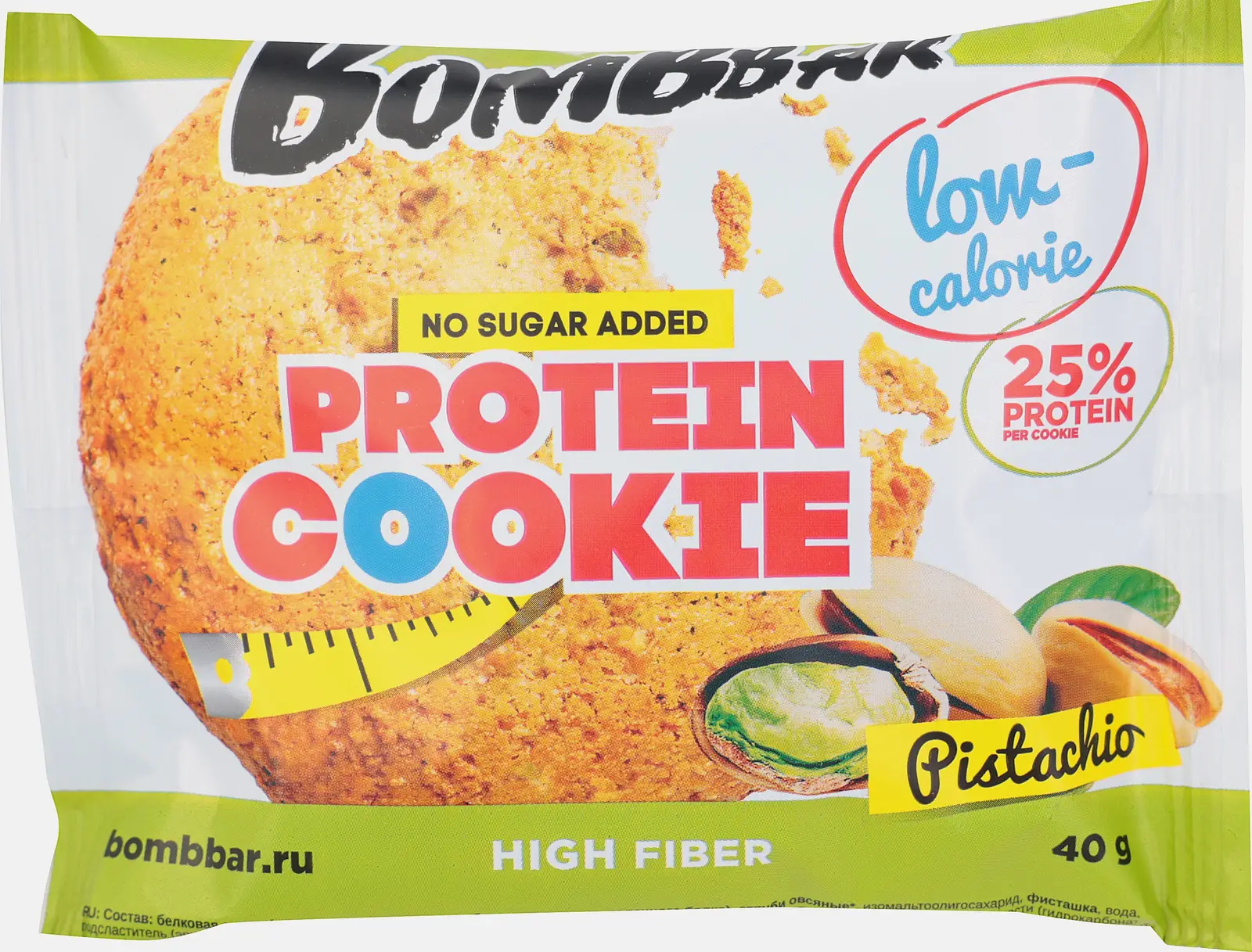 Низкокалорийная выпечка, богатая полезными волокнами и белком. Она отлично борется с чувством голода, придает сил для новых свершений. В одном печенье всего 104 калории. Фисташка в составе помогает поддержать уровень холестерина в крови, а также улучшить перистальтику кишечника. Она обладает мягким и нежным вкусом, который придает печенью пикантности. Наслаждаться лакомством могут не только спортсмены — оно пойдет всем, кто хочет восполнить недостаток белка и порадовать себя чем-нибудь сладким. В составе нет сахара и вредных примесей. Благодаря удобной упаковке полезную выпечку можно брать с собой куда угодно.