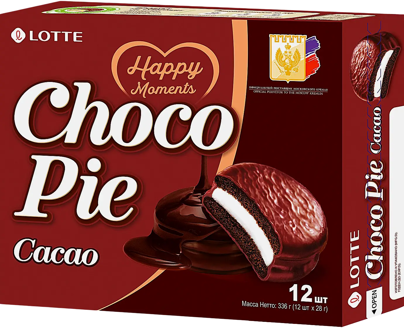 Печенье Lotte Choco Pie Cacao в глазури 12штx28г — знаменитое бисквитное печенье в индивидуальных упаковках. Привлекает внимание уже своей эффектной коробочкой, внутри которой находятся печенья-пирожные в индивидуальных пакетиках. Ароматные кружочки собраны по два в сэндвичи при помощи нежной желейной прослойки. Состав натуральный, без синтетических добавок или ароматизаторов, тесто пахнет ванилью и шоколадом, и имеет более темный цвет за счет добавления какао. Шоколадная глазурь также имеет выразительную какао горчинку, прекрасно дополняя печенье и начинку. Несмотря на обилие вкусов печенье не приторное. Десерт хорошо сочетается с кофе, чаем, другими горячими и прохладительными напитками.