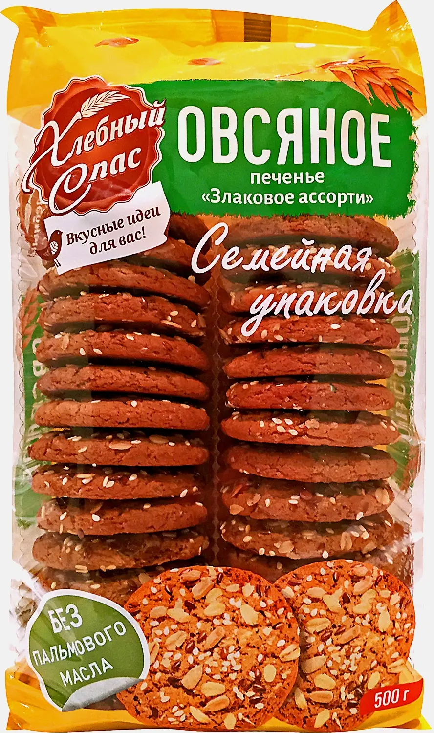 Печенье Хлебный Спас Овсяное Злаковое Ассорти 500г представляет собой вкусное, оригинальное угощение для всей семьи. Оно содержит в себе множество семян, благоприятно воздействующих на организм человека. Привлекательный внешний вид лакомству дарит специальная обсыпка, состоящая из 5 разновидностей злаков. Десерт не содержит ГМО и других вредных добавок. Он идеально сочетается с холодными и горячими напитками. Выпускается в прочной привлекательной упаковке, которая надежно сохраняет свежесть содержимого. Ее удобно брать с собой на прогулку, пикник, в дорогу или путешествие, и делиться с родными и близкими.