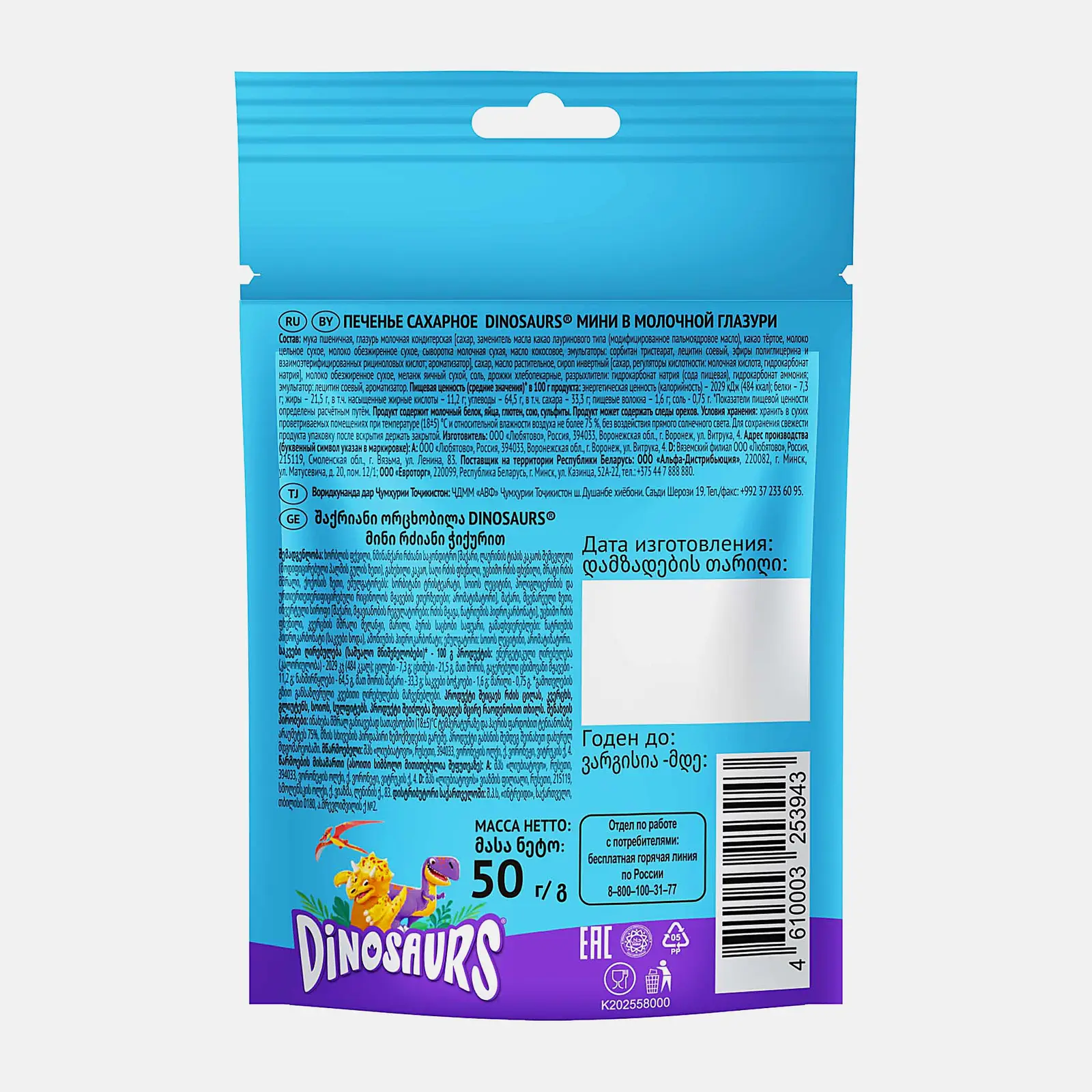 Это ассорти из нескольких разных дизайнов. В продукте не содержатся консерванты и ГМО, поэтому он безопасен для здоровья. Благодаря глазури лакомство приобретает сливочный вкус, который хорошо сочетается с молочным коктейлем, чаем или стаканом какао. Песочное печенье изготавливается из пшеничной муки и содержит подсластители. Источник витаминов группы В, Н, РР, Е, железа, фосфора и магния улучшает деятельность сердечной мышцы, функции кожного покрова, стимулирует синтез гормонов. Печенье поставляется в удобных для использования и хранения дой-пак упаковках. Они сохраняют вкусовые и питательные свойства продукта. Срок годности при температуре 5-20°С составляет 3 месяца.