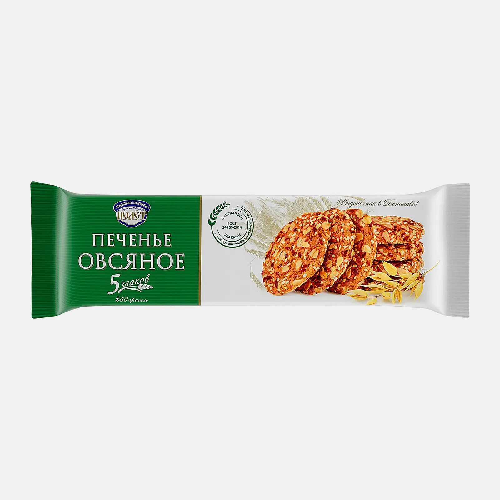 ПОЛЕТ Печенье овсяное 5 злаков 250г фл/п щедро усыпано семенами и злаками с добавлением изюма и орехов. Оно мягкое, рассыпчатое, с ароматом злаковых. Продукт имеет богатый витаминно-минеральный состав, поэтому приносит максимальную пользу организму. Приятный вкус хорошо сочетается с чаем, кофе, молоком и любой кисломолочной продукцией. Среди его основных компонентов есть овес, пшеница, семена льна и кунжута, ржаные и ячменные хлопья, а также корица и арахис. Для приготовления лакомства использованы растительные масла. Оно упаковано в герметично закрывающийся полиэтиленовый пакет, который сохраняет свежесть печенья надолго.