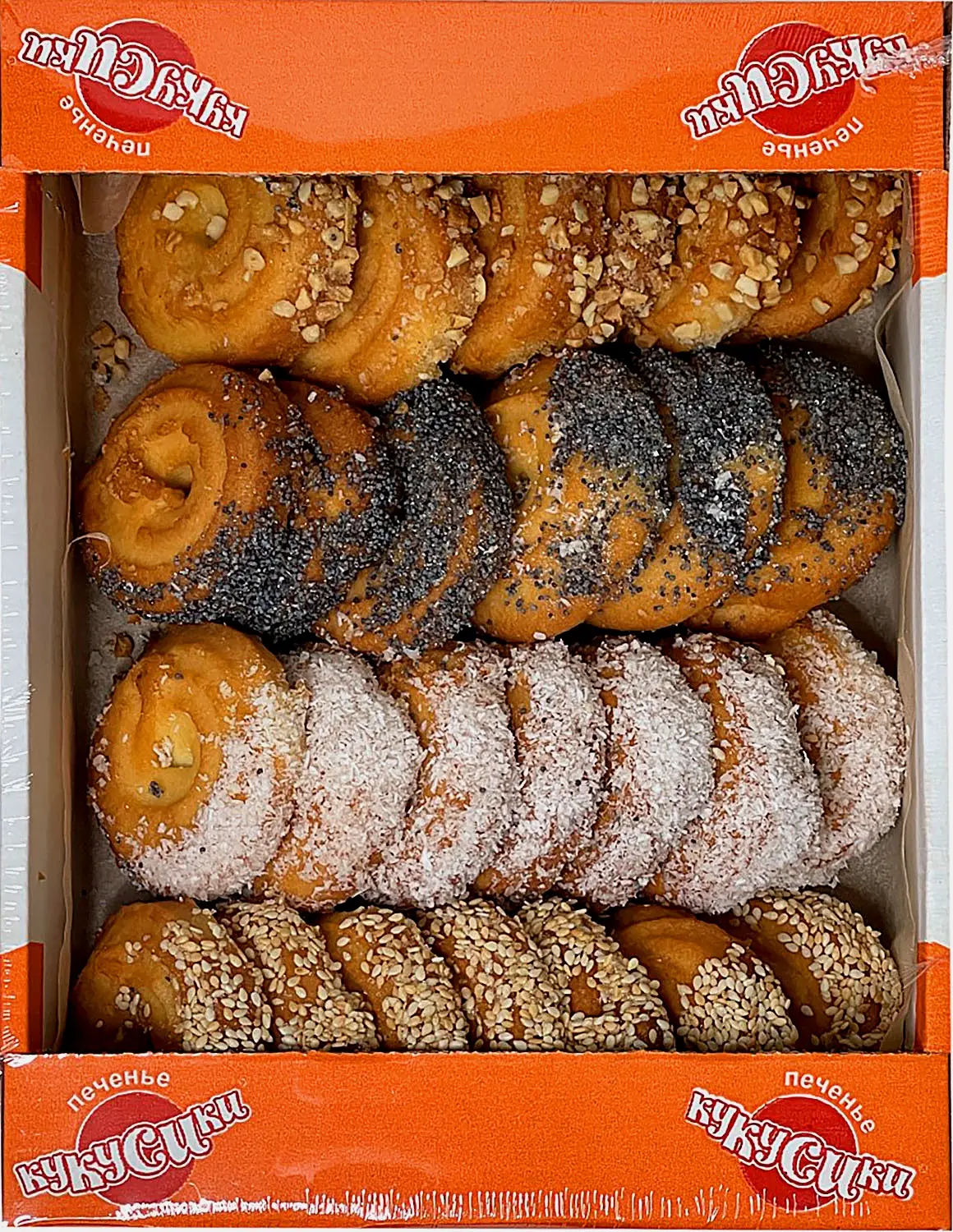 Ассорти из песочного печенья в форме колец соединило в себе самые популярные добавки — мак, арахис, кунжут и кокосовую стружку. В одной коробке 4 разных вкуса. Нежное, рассыпчатое лакомство со сдобным ароматом.