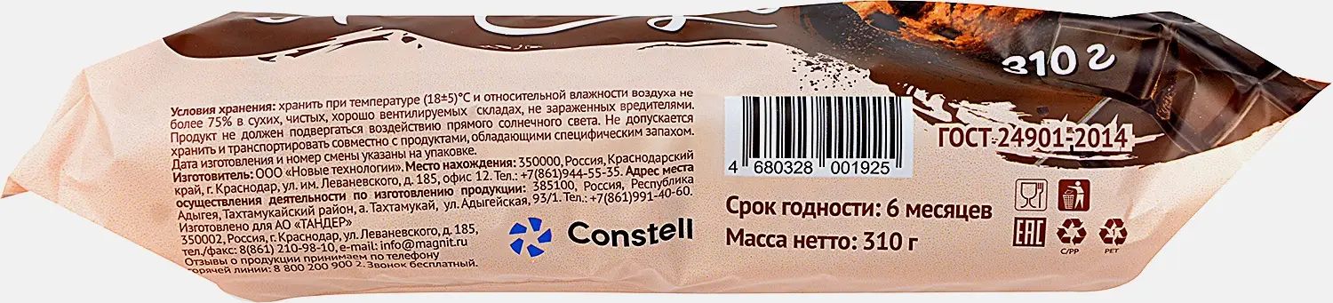 Печенье Магнит Сладония сдобное Американо 310г — вкусное угощение к чаепитию. Печенье в меру сладкое, не сухое, с приятным аппетитным ароматом. Кусочки шоколада в нём крупные и оставляют нежное послевкусие. Такое печенье можно слегка разогреть в духовке: тогда оно приобретёт совершенно новый, более насыщенный и яркий оттенок вкуса. Благодаря удобной упаковке лакомство удобно брать с собой для перекуса в офис или на учёбу. Печенье отлично сочетается с горячими напитками — чаем, кофе или какао. Оно зарядит энергией и хорошим настроением на весь день.