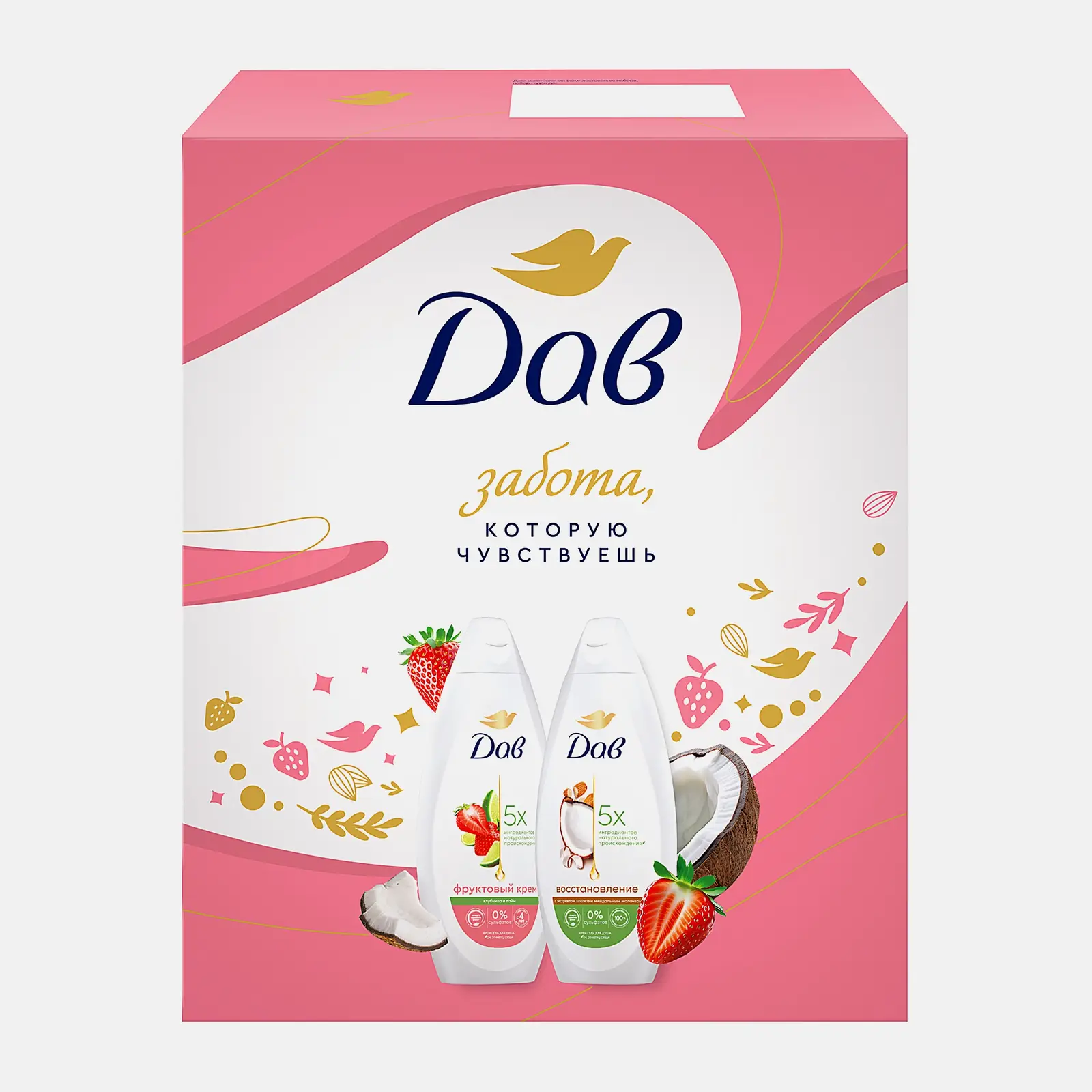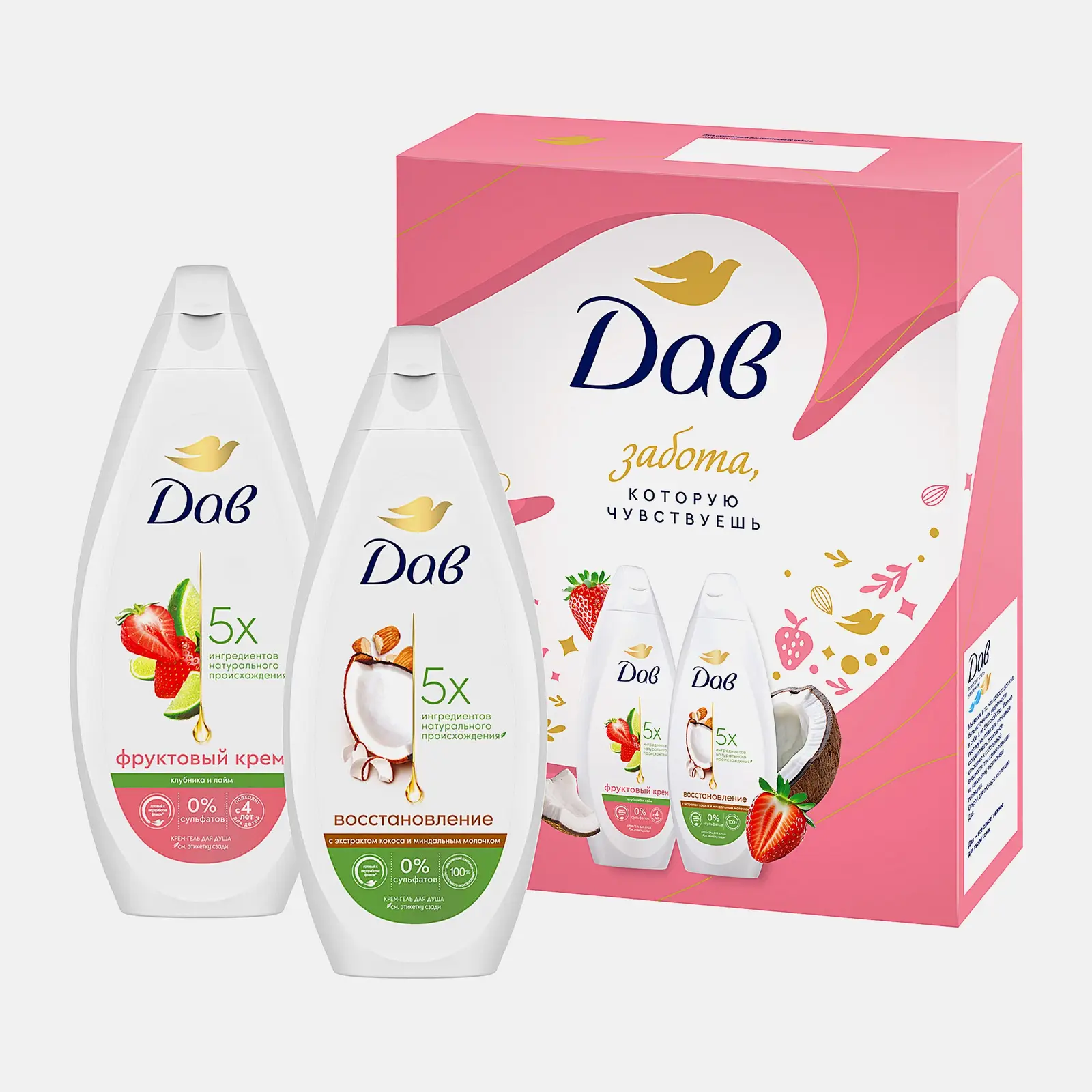 В набор для домашнего бьюти-ухода входят 2 крем-геля с ароматом клубники и лайма, а также с экстрактом кокоса и миндальным молочком. Средства на основе 5 ингредиентов натурального происхождения бережно ухаживают за кожей, делая её мягкой и увлажнённой. Не содержат сульфатов.