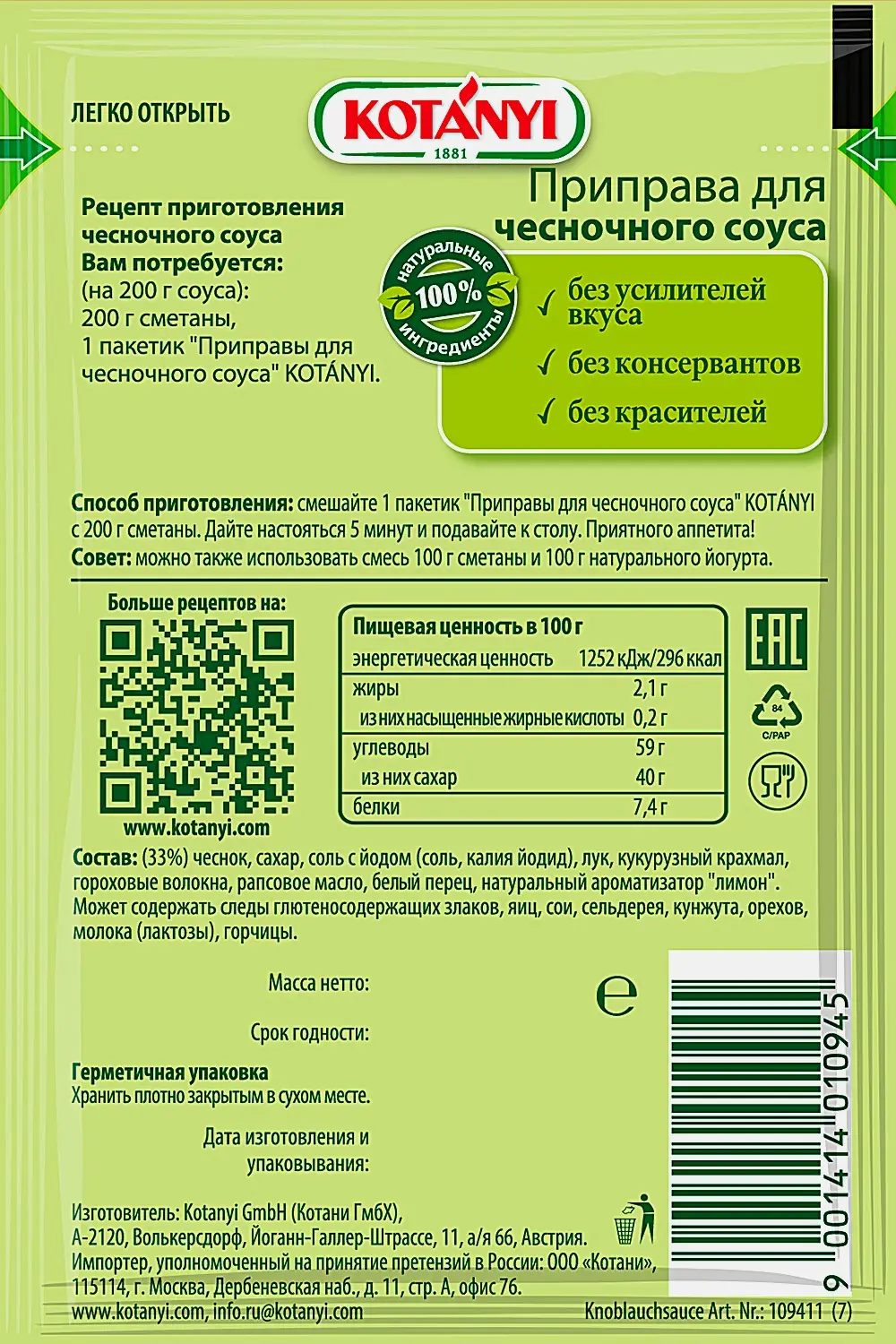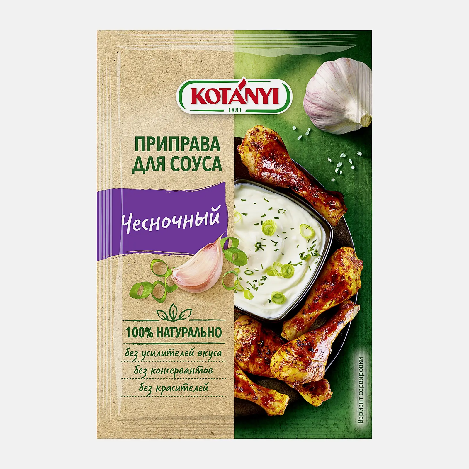 Приправа Kotanyi чесночный соус 13г создана специально для любителей чеснока и не содержит в себе лишних ароматных ингредиентов в виде пряных трав и других специй с ярко выраженным вкусом. Добавлен лишь белый перец, который дает остроту и не портит цвета, а также лимонный ароматизатор. В основе приправы — натуральный сухой чеснок, перемолотый в порошок. В качестве загустителей используются картофельный крахмал и гороховые волокна. Соус готовится очень быстро: достаточно смешать содержимое пакетика со сметаной или йогуртом и дать постоять не более пяти минут. Такая приправа подойдет к пельменям, холодной телятине, закусочным рулетам из лаваша. В соус можно макать запеченные куриные крылышки и картофель фри.