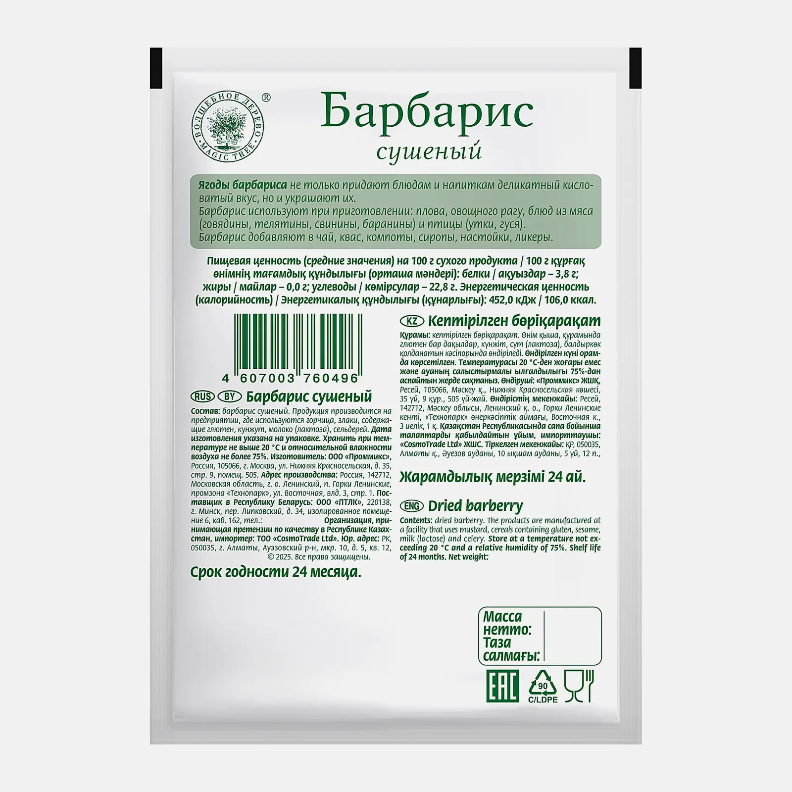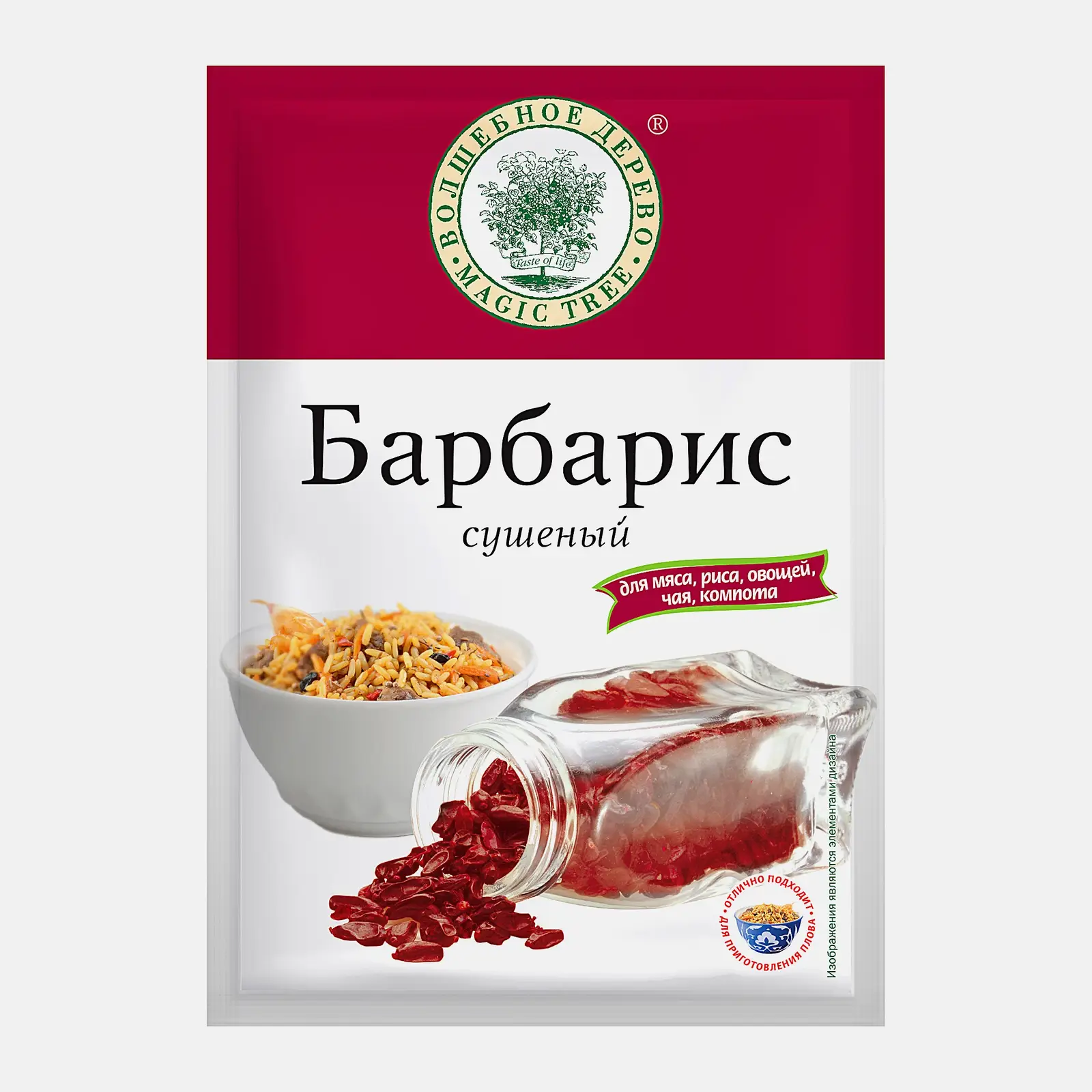 Приправа Волшебное Дерево Барбарис сушеный 10г отлично подходит для приготовления плова. Восточная добавка придаст любому блюду пряный вкус и насыщенный аромат. Как специя барбарис также подходит и для сладких продуктов (компот, желе, варенье). Внешне упаковка выполнена в виде плотного герметичного полиэтиленового пакета. Рекомендуется после вскрытия пересыпать содержимое в более удобную для использования емкость. В барбарисе содержатся витамины, которые укрепляют иммунитет и способствует улучшению настроения.