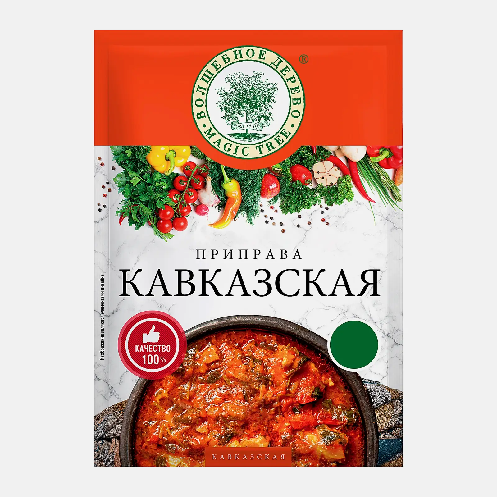 Кавказская приправа — это ароматное и многослойное сочетание различных специй. Она обладает ярким вкусом и ароматом, с глубокими нотками пряностей и трав. В основе состава — кориандр, морская соль, хмели-сунели, чёрный перец, кумин, базилик и чабер.
