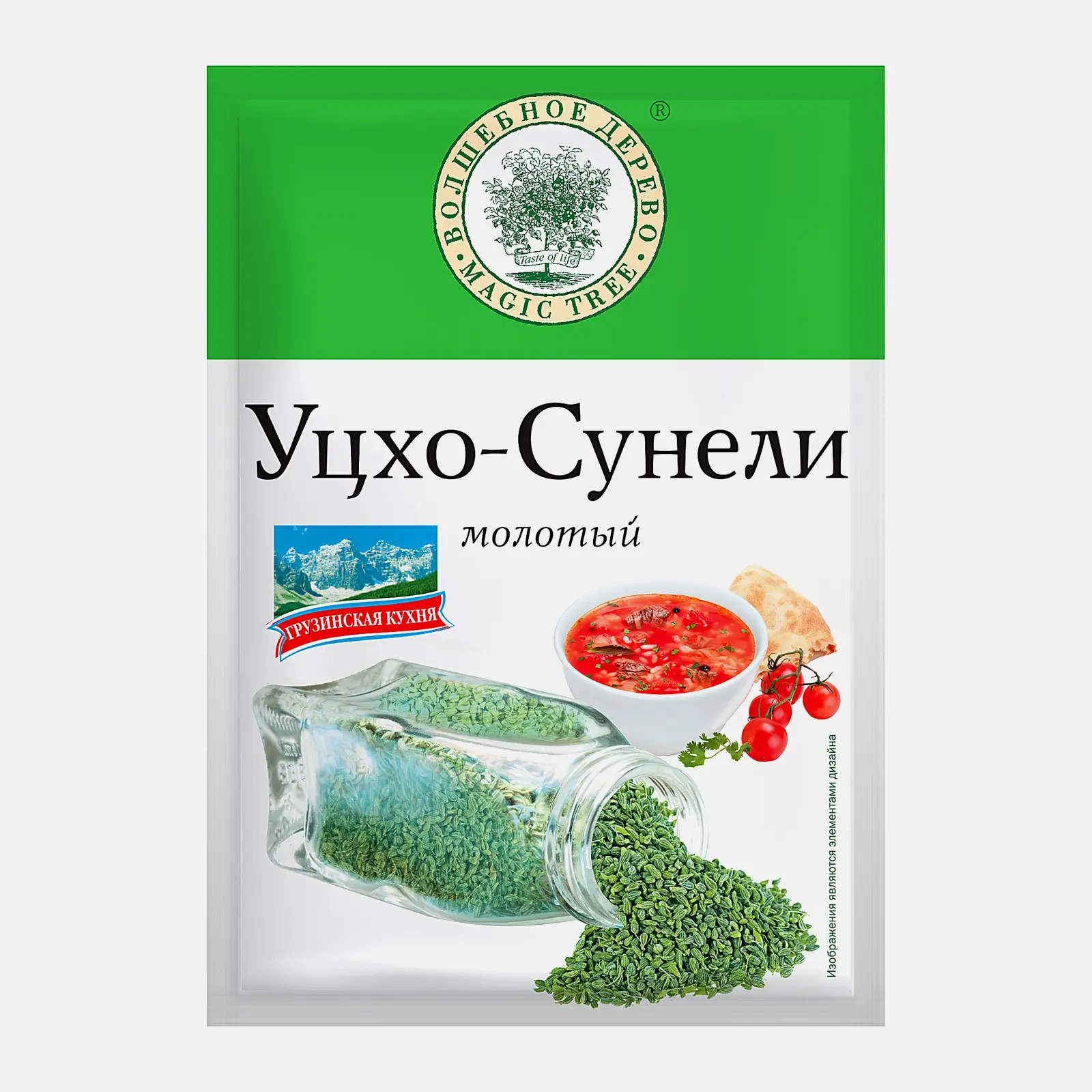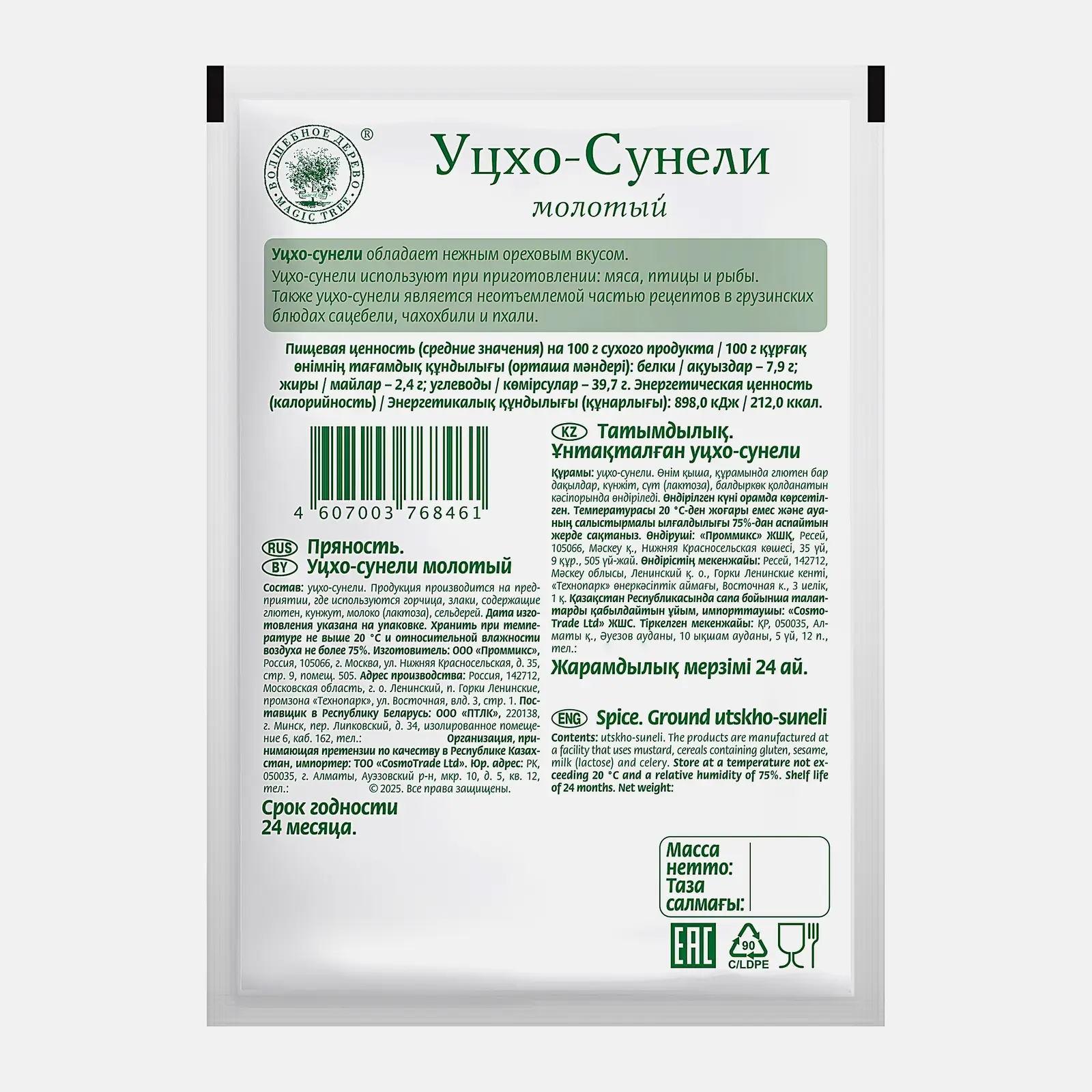 Пряность на основе уцхо-сунели (голубого пажитника) с добавлением сушёных овощей. Обогащает вкус и аромат блюд. Подходит для сацебели, чахохбили, пхали, а также мясных, овощных и ореховых блюд.