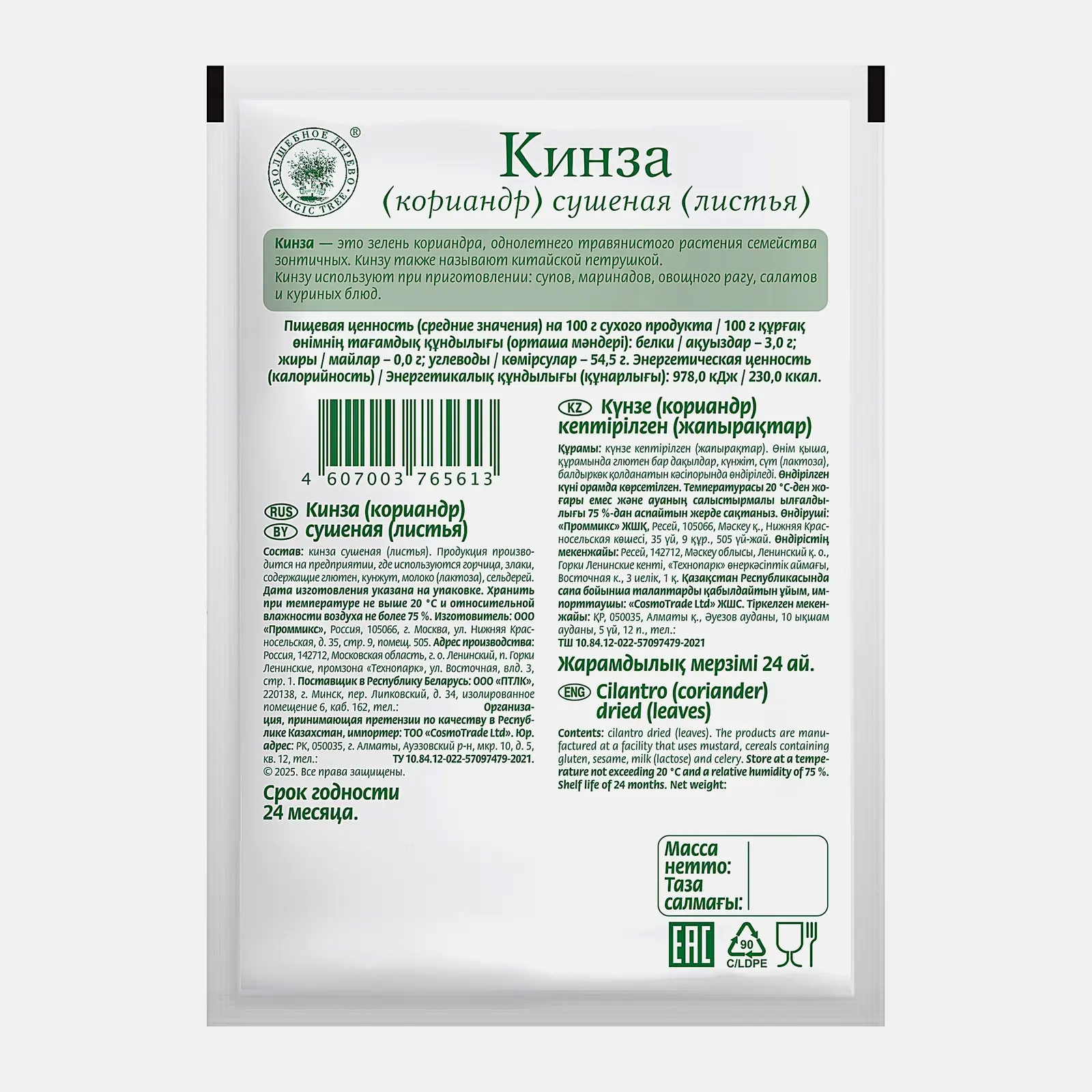 Приправа получена из отборных листьев кинзы и изготовлена при помощи деликатной сушки — это позволило сохранить насыщенный зелёный цвет и большую часть питательных веществ. У листьев кинзы слегка горьковатый вкус и резкий пряный аромат.