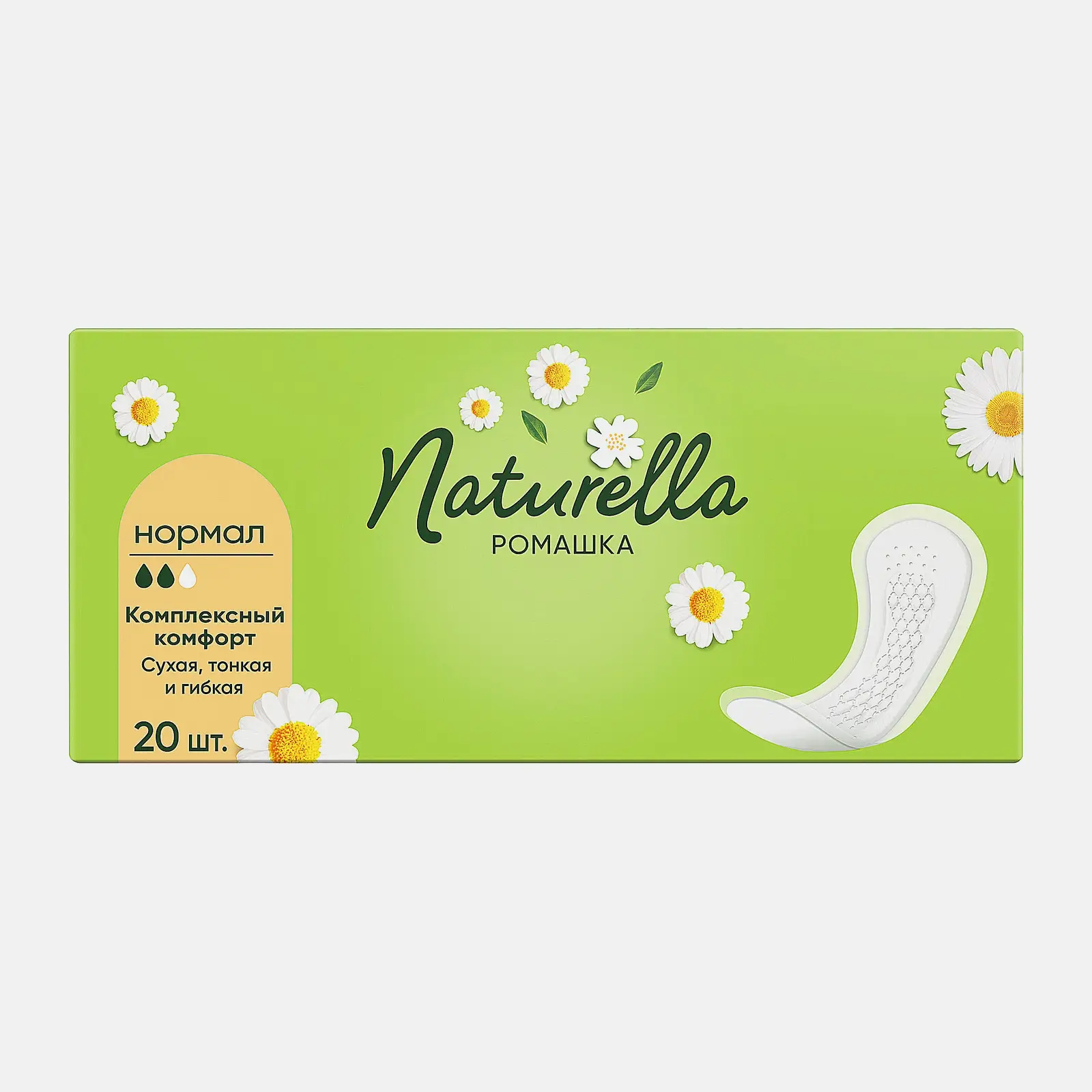 Тонкие и гибкие ежедневные прокладки с ароматом ромашки дарят ощущение свежести и комфорта. Мягкая дышащая поверхность подходит для ежедневного использования. Надёжно фиксируются и не смещаются в течение дня. Протестированы дерматологами.