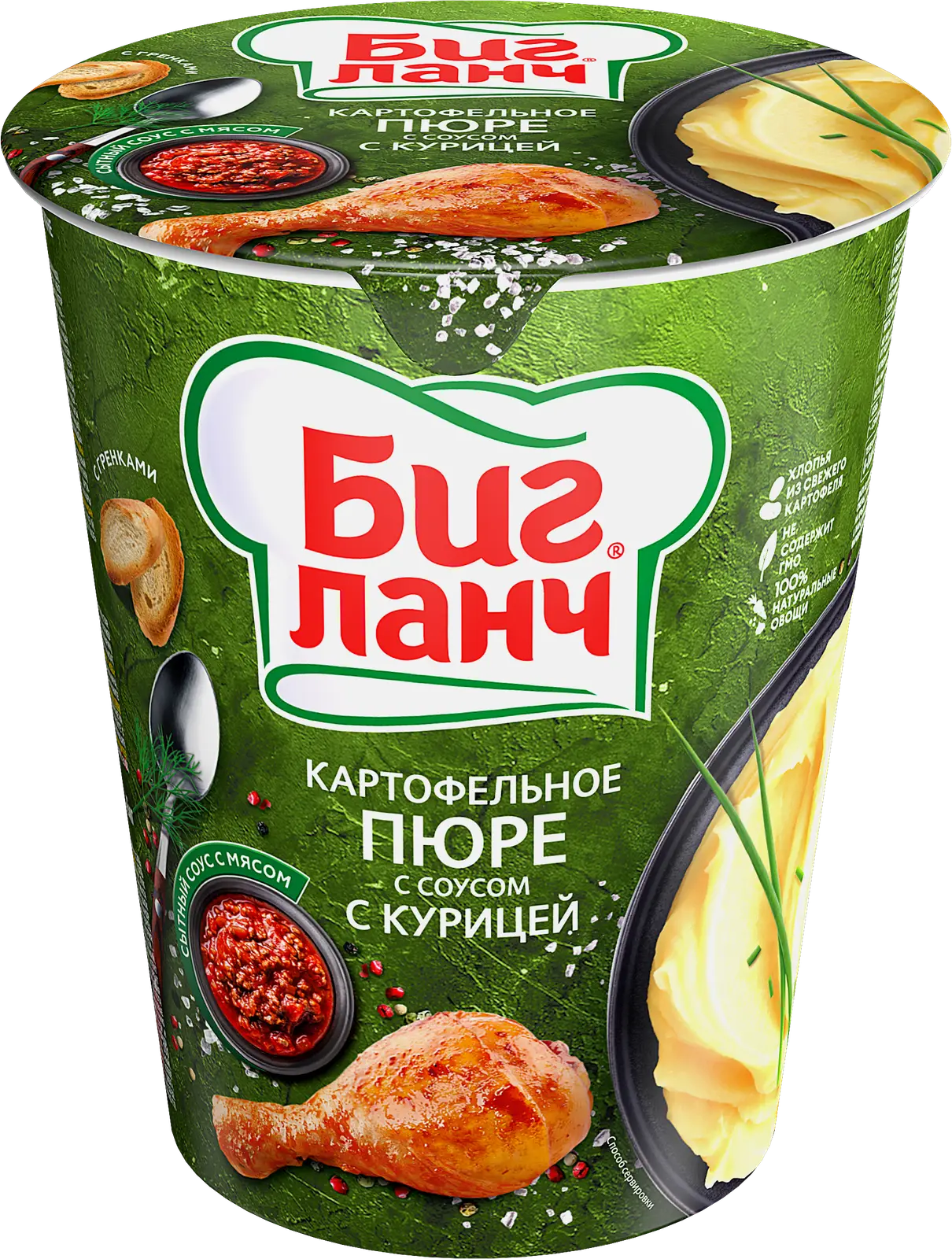 Картофельное пюре Биг Ланч с курицей 50г — популярный продукт быстрого приготовления. В продажу поступает в упаковках по 50г. В пюре содержатся картофельные хлопья, жареный репчатый лук, гренки, сушеный укроп и лук, куркума, чеснок и куриное филе. Это отличный вариант для быстрого перекуса. Способ приготовления достаточно прост: достаточно залить содержимое стаканчика кипятком (до указанной метки) и накрыть его крышкой. Через 3 минуты в пюре добавляют соус и тщательно все перемешивают. Блюдо готово к употреблению. Калорийность продукта составляет 340 ккал, поэтому он быстро и надолго утоляет голод.