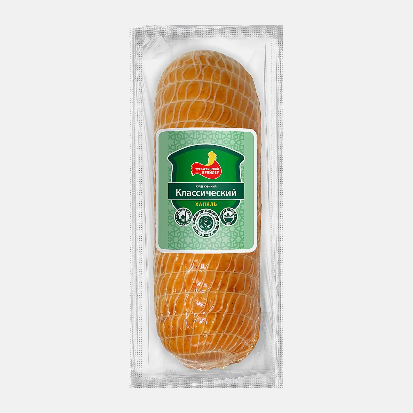 Рулет Турбаслинские бройлеры Куриный Классический халяль варено-копченый изготовлен из мяса цыплят. Оригинальный букет специй дополняет богатый вкус аппетитного деликатеса. Благодаря плотной консистенции готовый к употреблению продукт легко режется на аккуратные пластины любой толщины и при этом не крошится. Он подходит как приготовления вкусных бутербродов к завтраку, так и для создания изысканных канапе или красивой нарезки к праздничному застолью. Мясной деликатес используется также в качестве начинки для пиццы, слоек и других изделий из теста. Срок годности рулета составляет 30 суток.