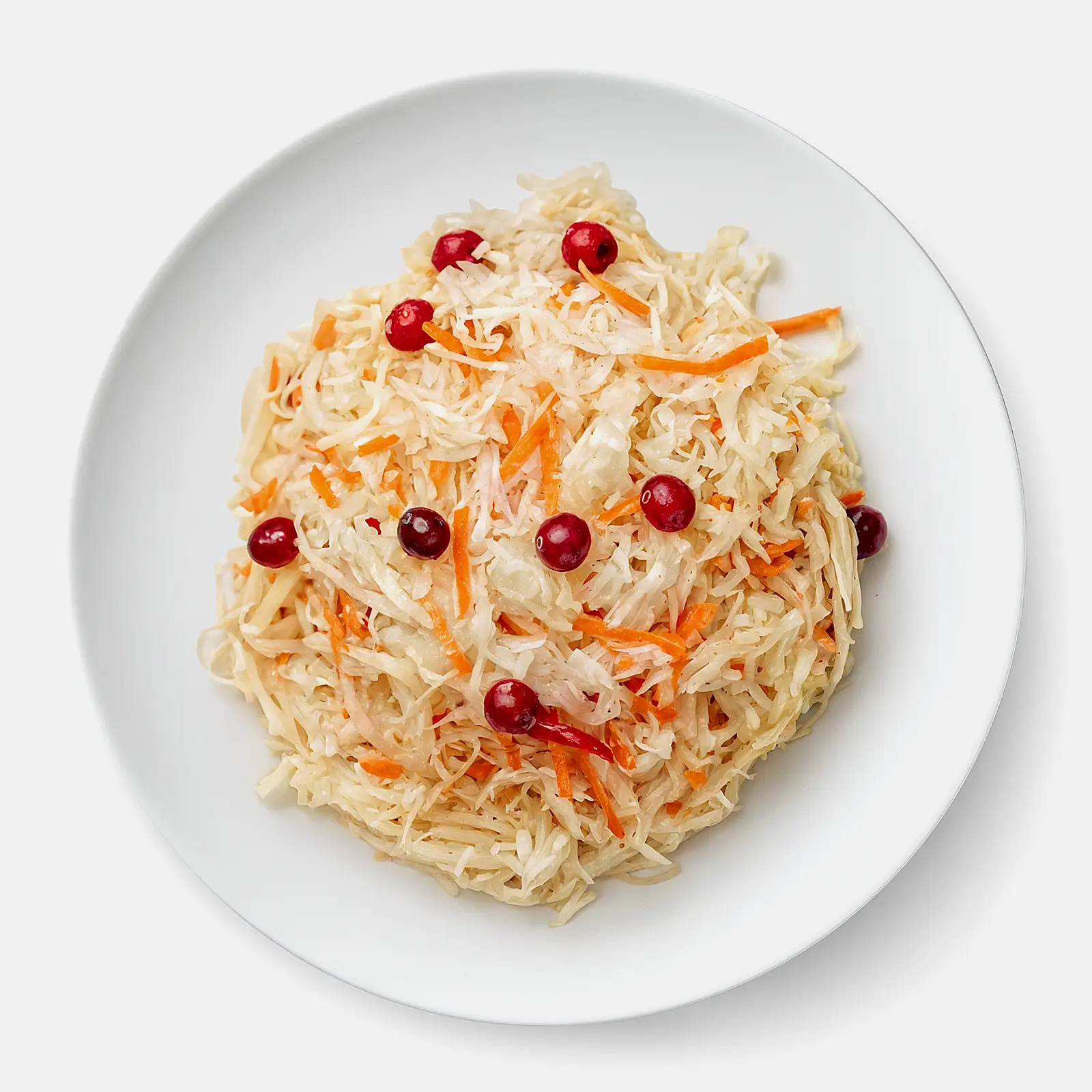 Классическая закуска с сочной капустой, болгарским перцем, сладкой морковью и терпкой клюквой. Ломтики капусты не слишком крупные и не мелкие, что делает текстуру особенно аппетитной и хрустящей. Продукт приготовлен методом холодного маринования, благодаря чему сохранились свежий овощной аромат и натуральная плотность ингредиентов.